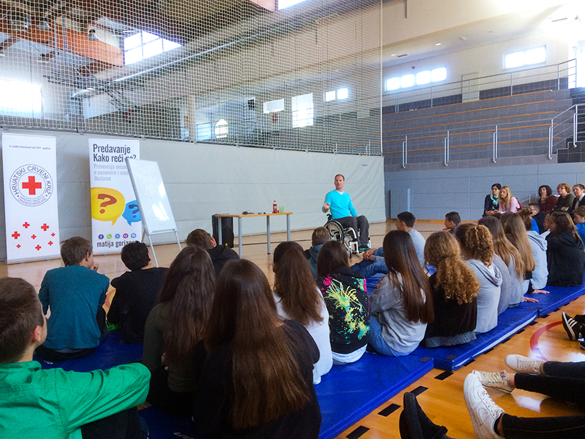 Gradsko društvo Crvenog križa Krk, povodom tjedna Crvenog križa, u našoj je školi organiziralo tribinu “Kako reći ne?” koju provodi Matija Gorjanec koji je kroz vlastita iskustva sa alkoholom, drogom i rizičnim ponašanjima doveo svoj život u pitanje, ali se snagom volje i pomoću dobrih ljudi uspio izvući iz pakla svog života te danas djeluje kao predavač koji upozorava i približava mladim ljudima svoje životno iskustvo kako bi digao svijest o istome.