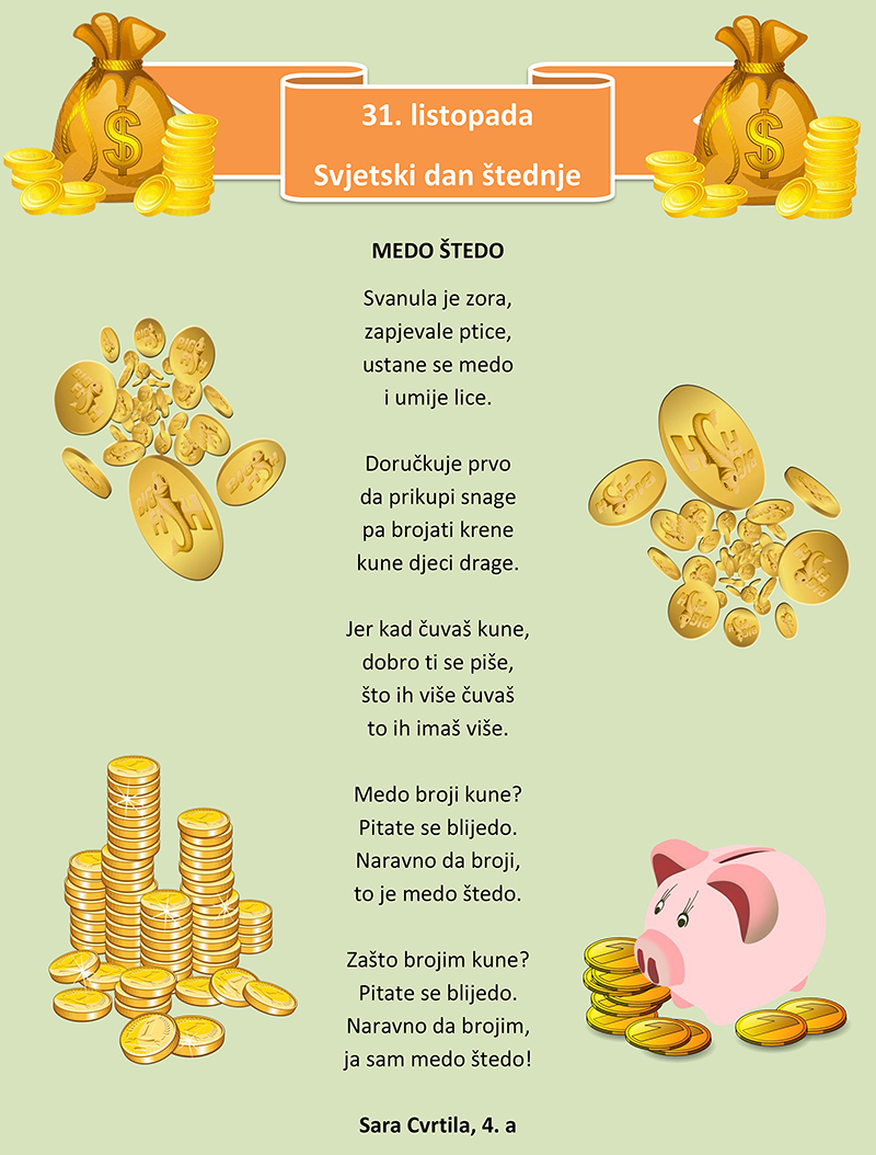 Povodom Svjetskog dana štednje donosimo pjesmu Medo Štedo koju je napisala Sara Cvrtila, učenica 4. a razreda.