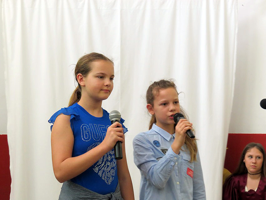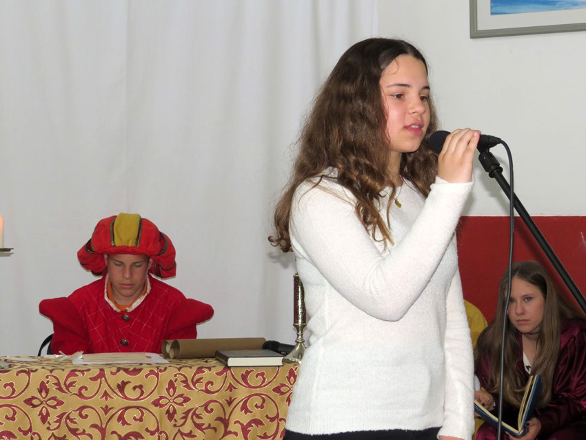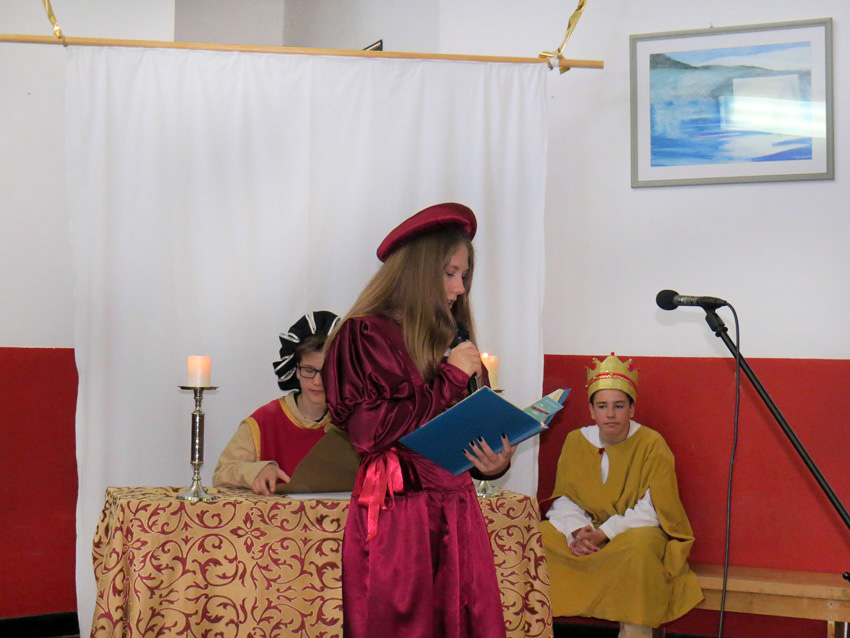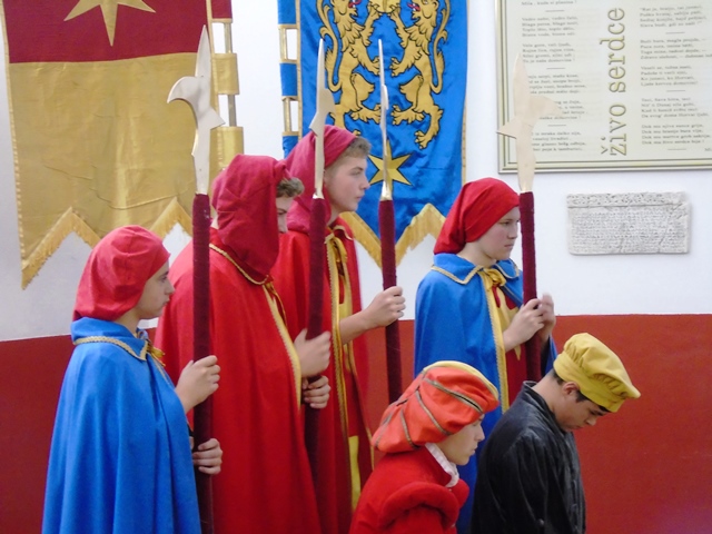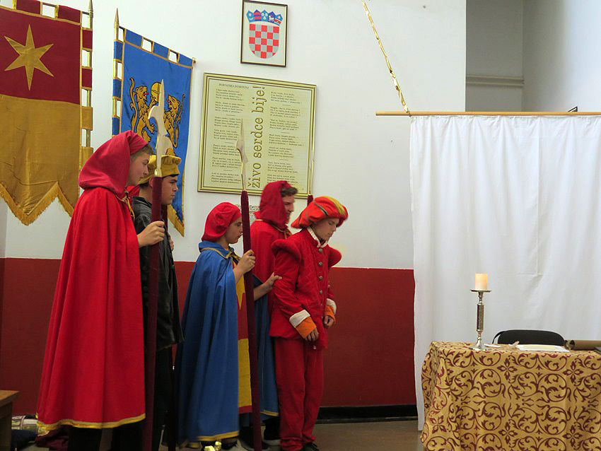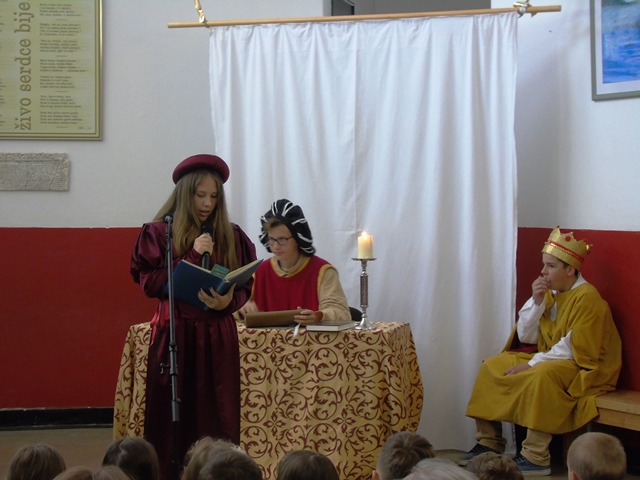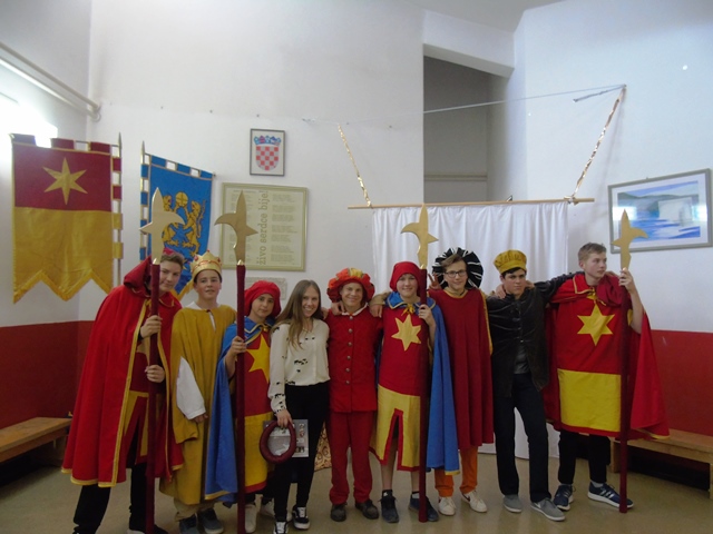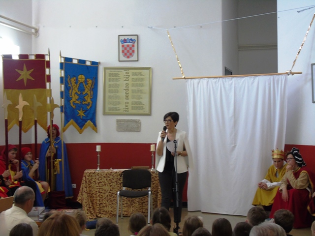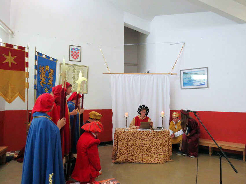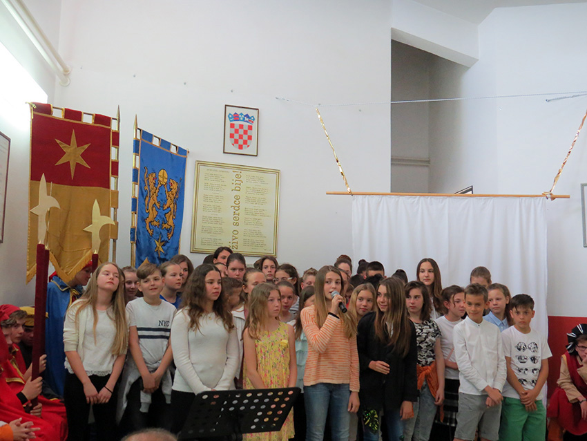 S početkom u 10 sati sestre Ilina na violini i Mia Lukić na klaviru, odsvirale su hrvatsku himnu i time svečano otvorile glazbeno – scensku priredbu u holu škole. Kroz priredbu vodila nas je voditeljica Mia Žužić, učenica 8.a razreda. Pod vodstvom profesora Davora Burlovića veliki školski zbor nas je pjesmama prisjetio frankopanske tradicije.