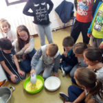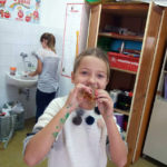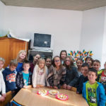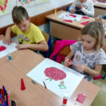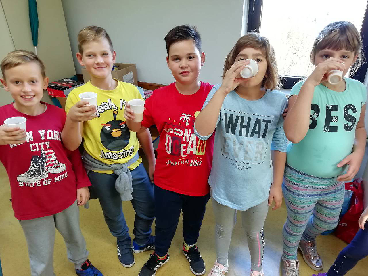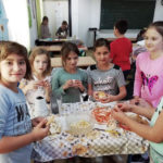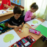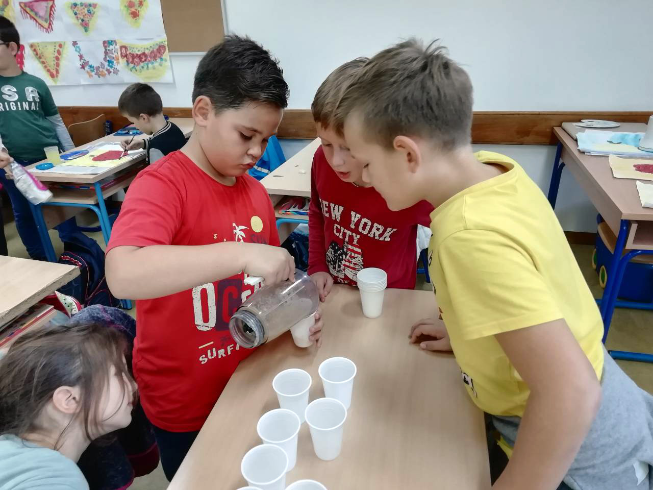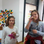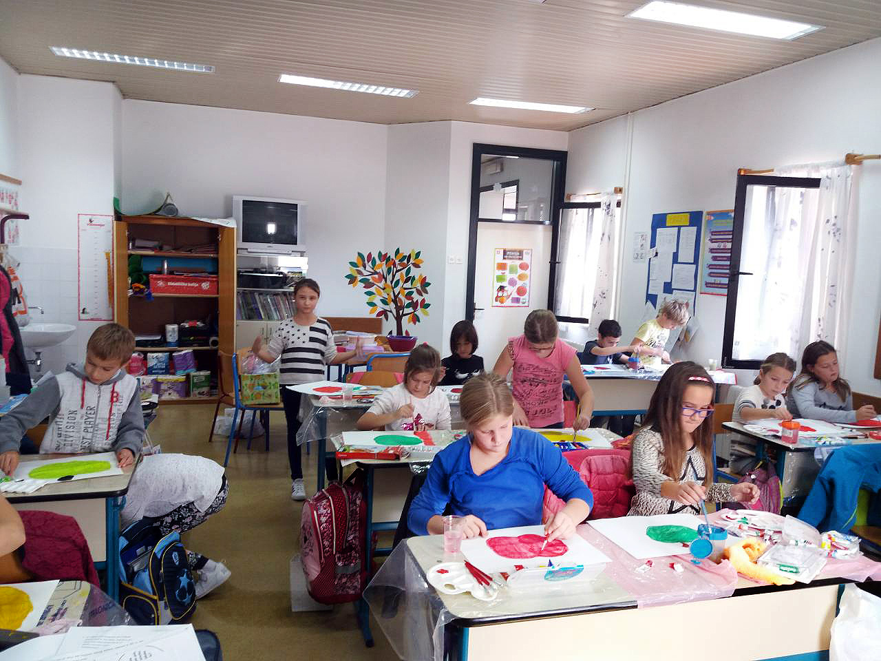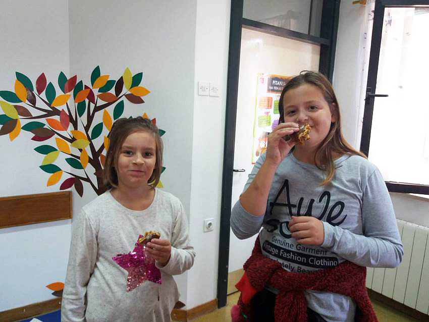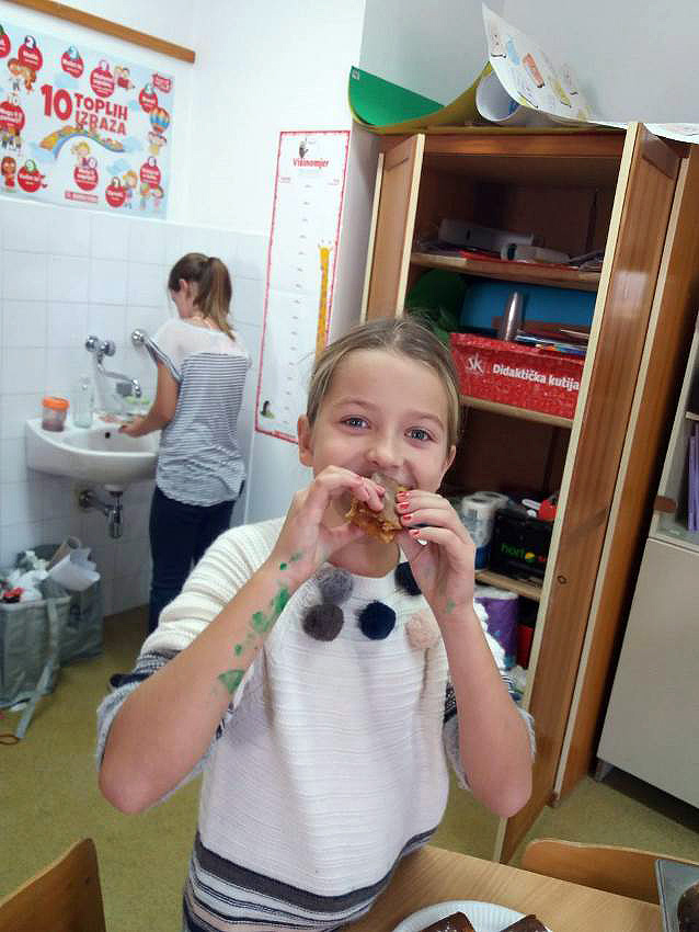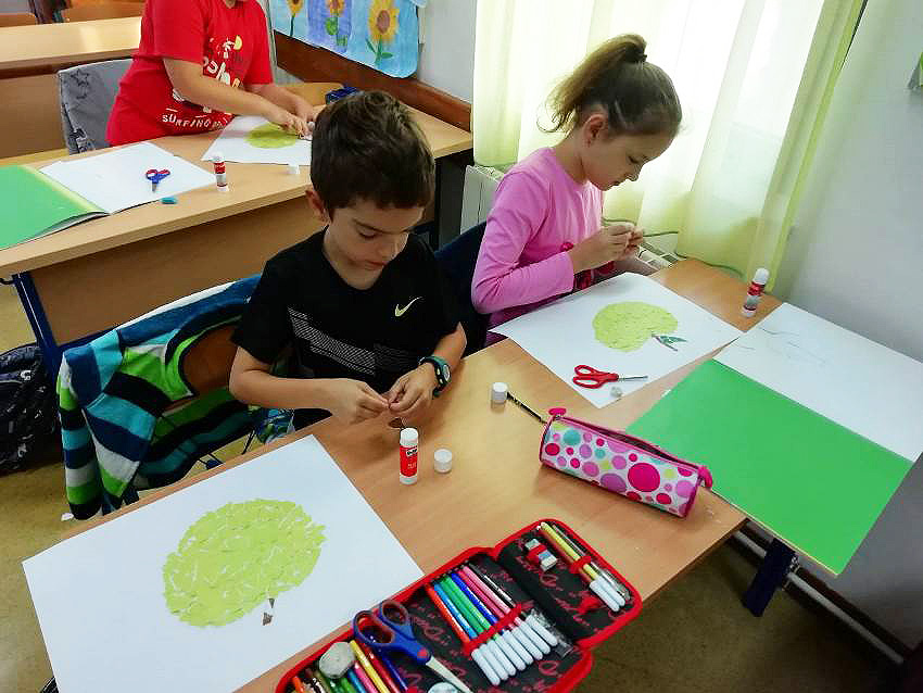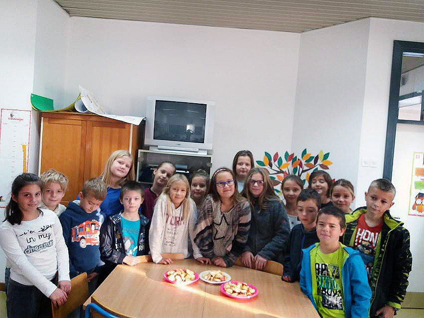Učenici 3.b također su marljivo radili. Na satu Likovne kulture, trgajući kolaž papir oblikovali su jabuke. Donijeli su u školu još nekoliko vrsta voća te su sve skupa s jabukama sami očistili, ogulili i ubacili u blender te napravili ukusne smoothije. I njima je učiteljica Đana napravila te donijela fine kolače, a od jabuka koje su im ostale, učenica Eni Bužonja je kod kuće, uz pomoć svoje tete, napravila fini sok te ga donijela u školu.