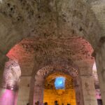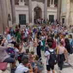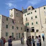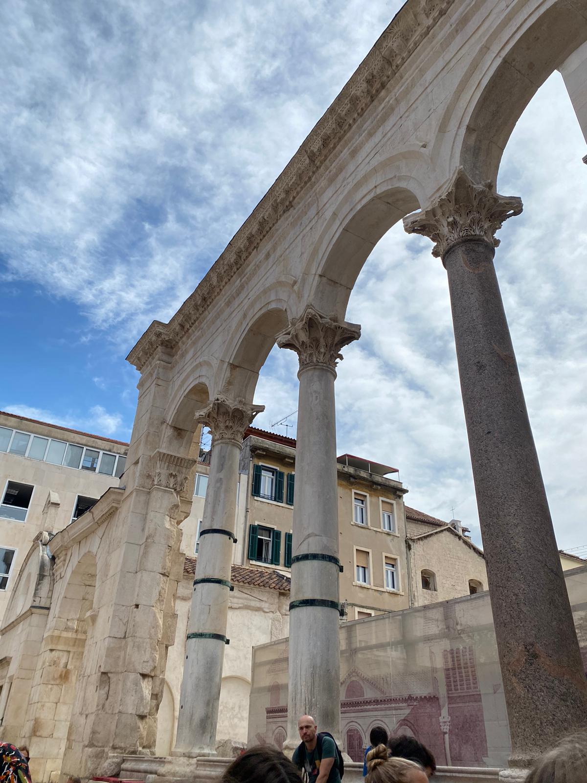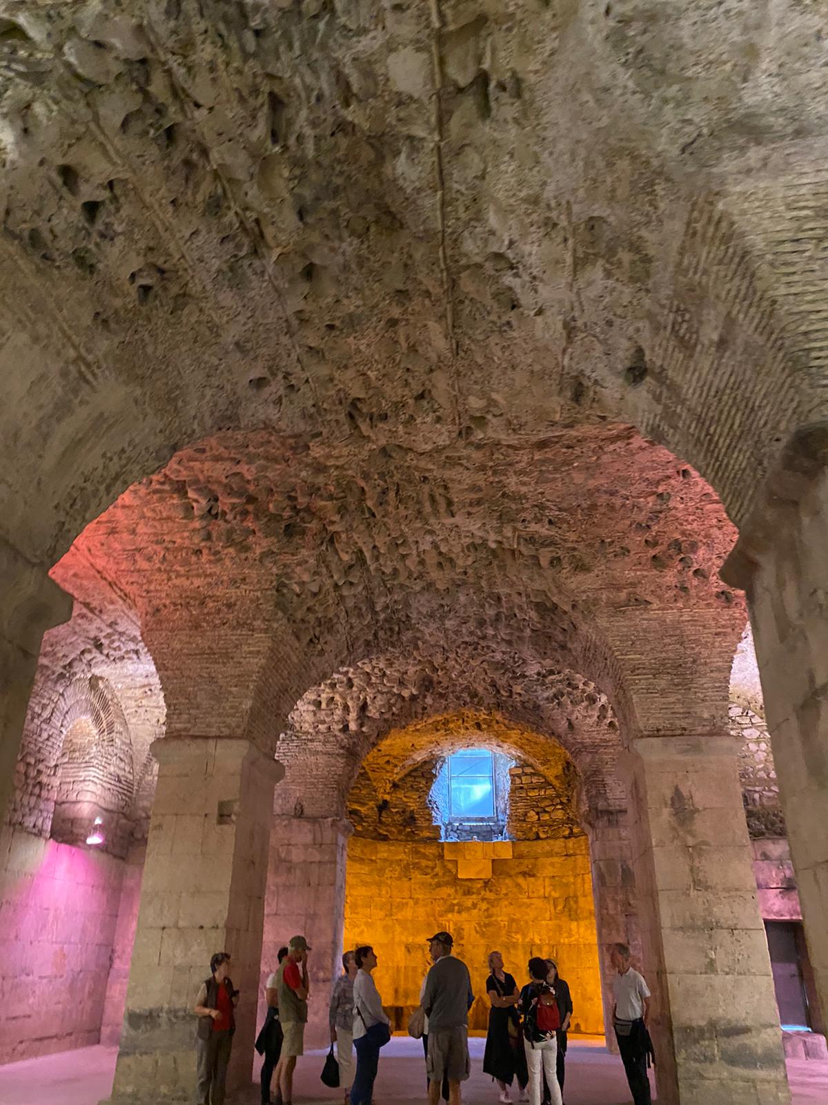 Ispred Dioklecijanove palače dočekala nas je naša vodičkinja koja se silno trudila opisati nam svaki detalj tog velikog grada. Najpoznatija građevina Splita je Dioklecijanova palača. Sagrađena je početkom 4. stoljeća kao kuća za odmor cara Dioklecijana. Unutar zidina izgrađena je i palača, hramovi, stambeni dio, kupke za cara i veliki trg. Ušao sam u Dioklecijanovu palaču kroz Brončana vrata. Odmah me zapuhnuo miris vlage i sumpora. Ovaj dio palače je tik uz more pa je često poplavljen, a miris sumpora se osjeti zbog izvora vode bogate sumporom što je i bio razlog da baš ovdje car izgradi palaču jer je bolovao od artritisa. U podrumima palače se organiziraju priredbe i koncerti, a suvenire je moguće kupiti na brojnim štandovima. U nekim od prostorija podruma snimali su se dijelovi popularne serije Game of Thrones. Iznenadio sam se kada sam saznao da su podrumi dugo godina bili zatrpani kanalizacijom i smećem te da još uvijek postoje prostorije koje nisu očistili. Na jednom zidu mogao sam vidjeti okamenjene ostatke tih nečistoća što mi se baš i nije svidjelo.