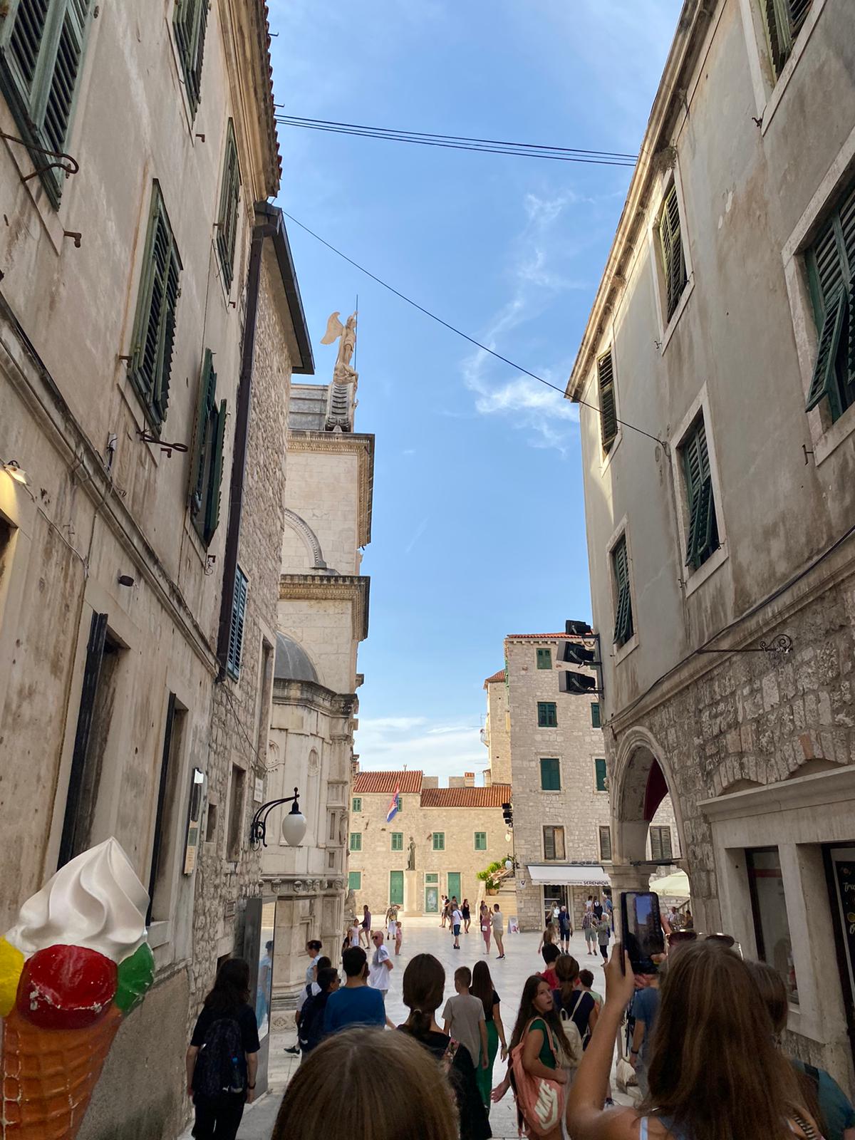 Šećući ulicama Šibenika sve mi je bilo zanimljivo jer još nikad nisam bila u tom gradu. Kamenim ulicama došli smo do jednog trga. Ispred nas je bila najveća znamenitost grada, katedrala sv. Jakova. Za nju sam i čula, i vidjela sam je na slikama, ali ni približno nije bila lijepa kao uživo. Prvo sam usmjerila pogled prema nebu. Prvo što sam ugledala bio je kip arkanđela Mihaela kako ubija sotonu, vraga. Nešto više kipa bila je kupola na čijem se vrhu nalazio anđeo s križem. Tek kada smo ušli u katedralu, primijetila sam da je cijela od kamena. Bila sam impresionirana glavnim oltarom, stupovima, bočnim oltarima, krstionicom… Pomislila sam koliko je graditeljima i umjetnicima bilo potrebno vremena i strpljenja za svaki detalj koji i danas prkosi vremenu te oduševljava putnike namjernike.