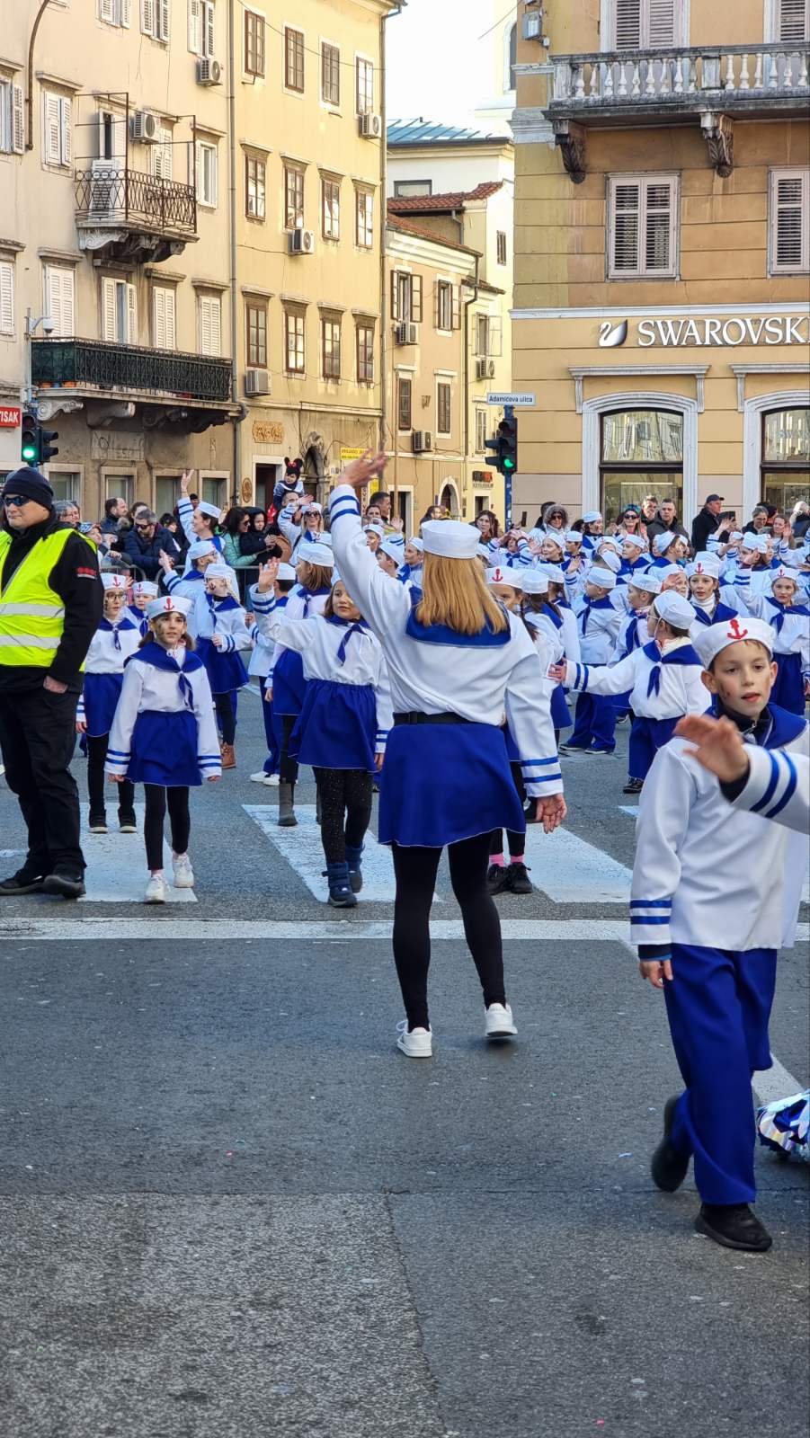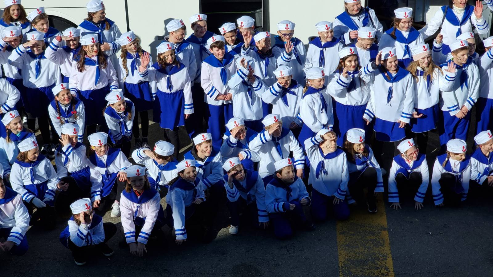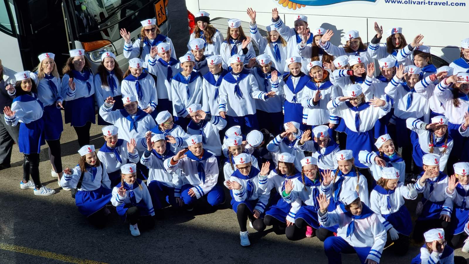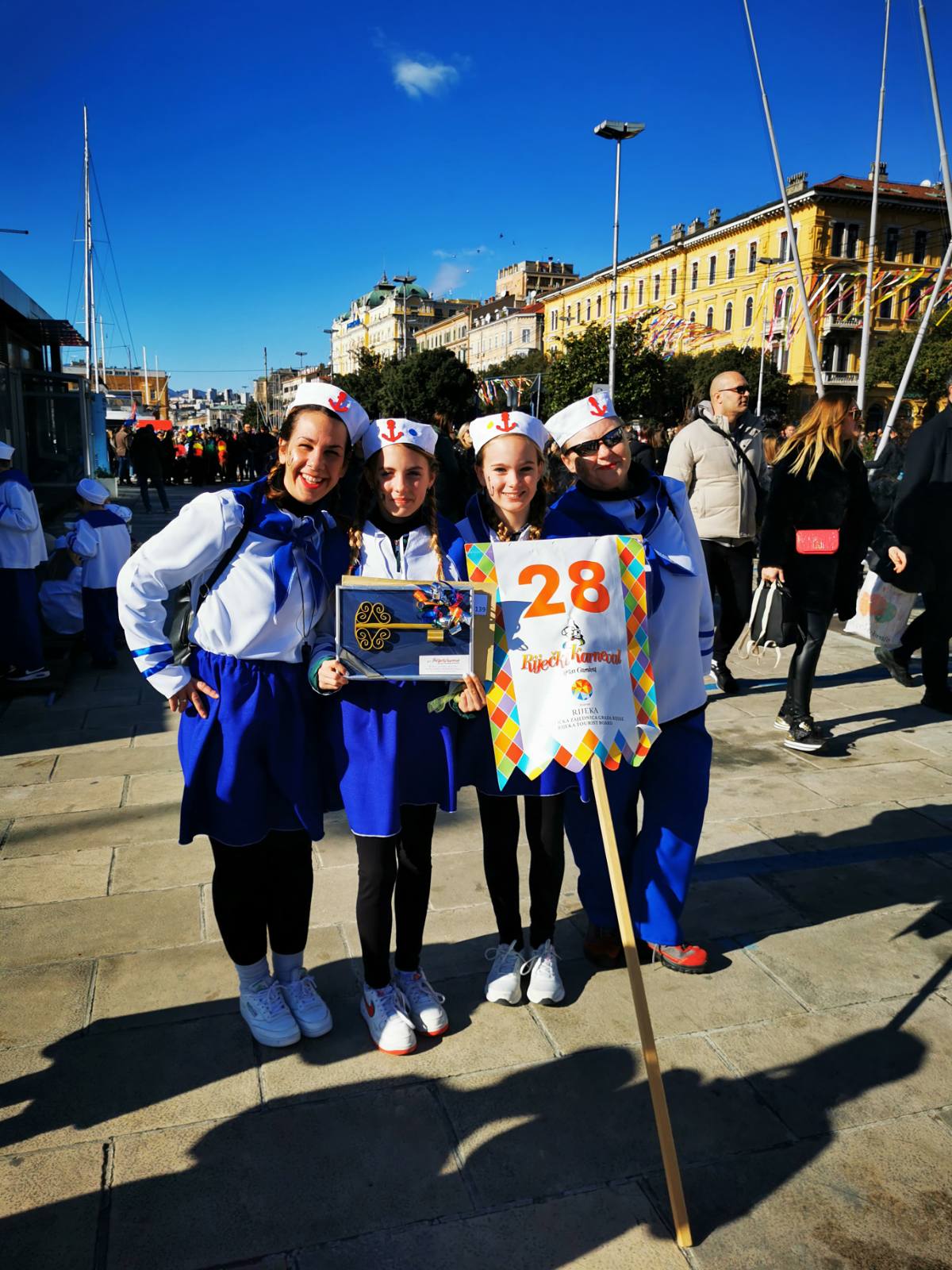 Konačno je stigla i ta subota za koju smo se dugo i marljivo pripremali. Dan je bio sunčan, a bura koja je puhala nije nas mogla omesti. Autobusna stanica u Malinskoj bila je puna uzbuđenih malih maškara i njihovih najbližih koji su ih došli ispratiti. Nakon šminkanja uslijedili su, sad već tradicionalni, ples i fotografiranje, a zatim su tri autobusa s našim mornarima i s dvanaest učiteljica, krenuli prema Rijeci. Šarena i razigrana Riječka riva bila je ispunjena djecom maskiranom u svakakve maštovite maske. Sa zanimanjem smo pratili sve što se oko nas događa i strpljivo čekali svoj red za veliki nastup. Jedva smo dočekali da i mi krenemo u povorku. Otplesali smo svoju koreografiju kroz cijelo Korzo i odlično odradili sve četiri pozornice te tako „doplovili“ i do posljednje, pete pozornice u zgradi Ex port Delta gdje smo za svoj trud nagrađeni krafnama i sokovima. Umorni, ali ispunjeni srećom i dopraćeni burom, vratili smo se na naš Zlatni otok, u našu Malinsku valu gdje su nas čekali ponosni roditelji.