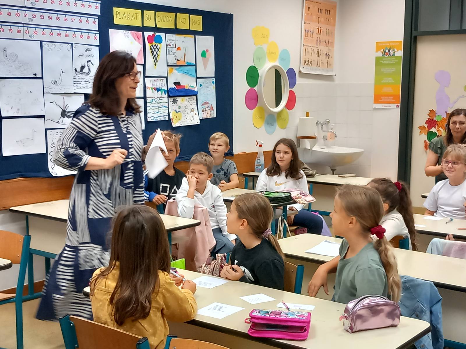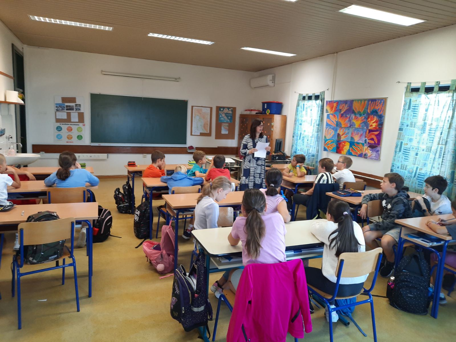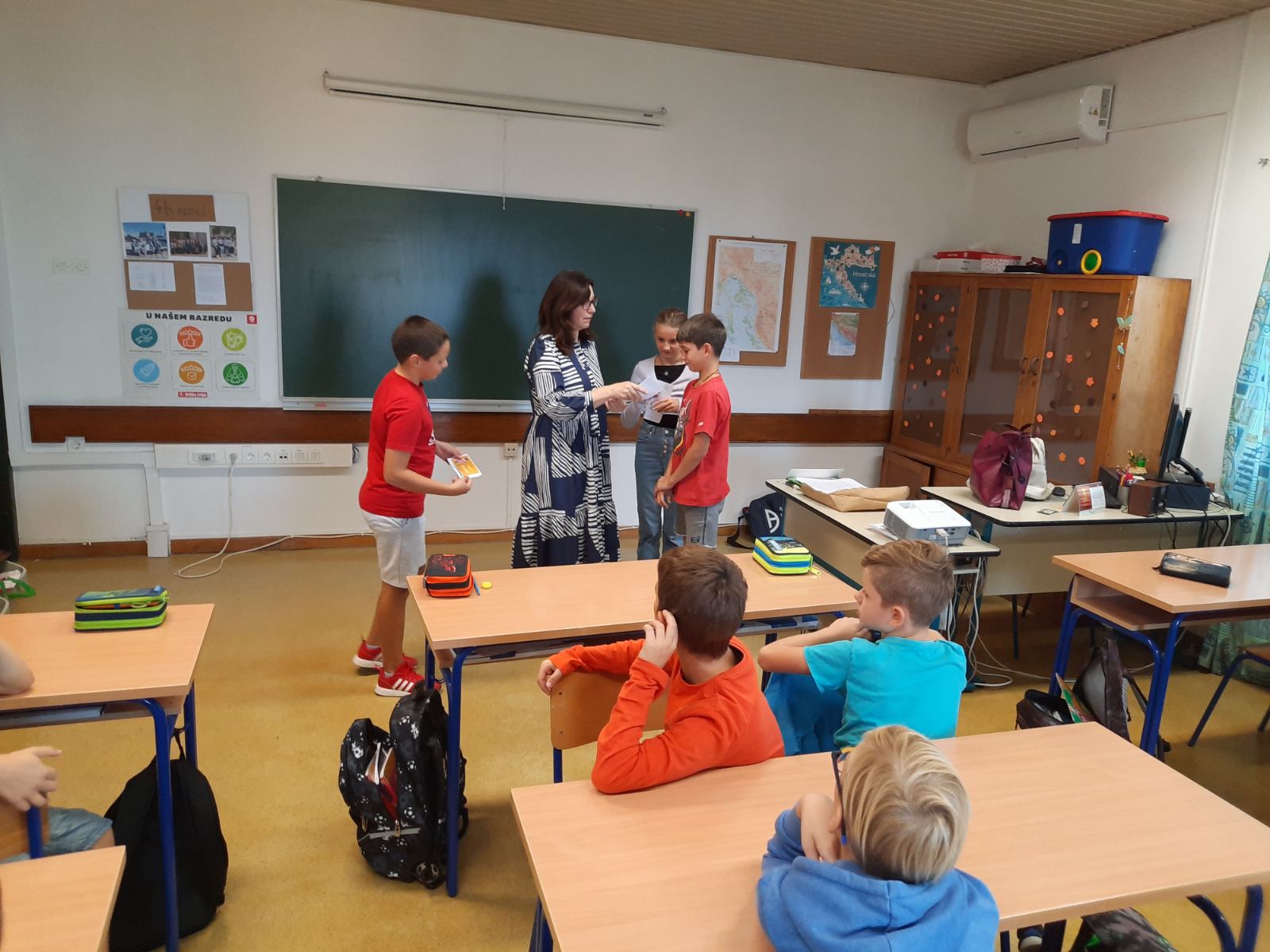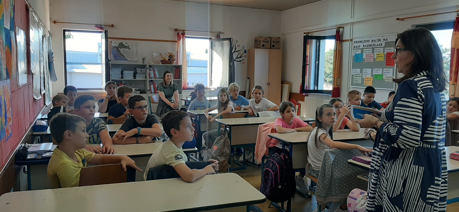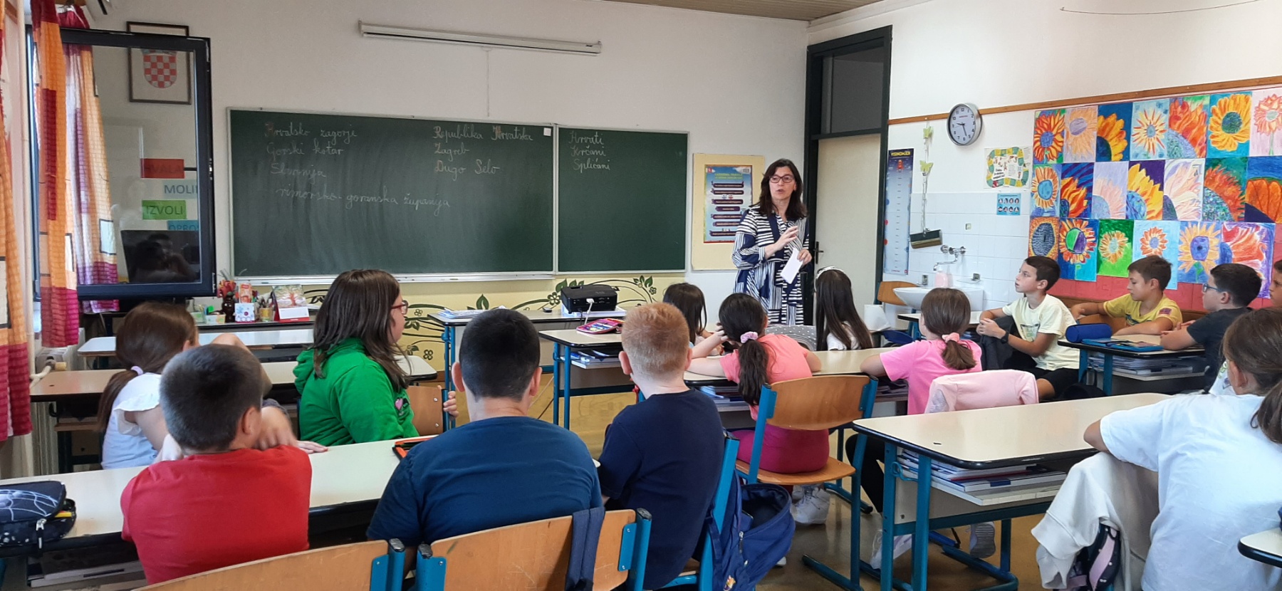 U petak 29. rujna posjetila nas je učiteljica Ivančica Toić, jedna od autorica Knjigomjera, interaktivne bilježnice za obradu lektirnih djela. U sklopu projekta Radionice za poticanje čitanja održala je u 2.a sat na kojem su djeca čitala, glumila, bojala, izrađivala trioramu – tehniku slaganja papira. Bilo nam je zabavno, smiješno i poučno. Satu su prisustvovali i promotori iz Školske knjige Maša Amalija Juretić i Dražen Rubeša. Tako da su u učionici bile, kako su djeca rekla, tri učiteljice i jedan učitelj. Svi smo marljivo crtali, bojali i na kraju napravili izložbu naših radova.