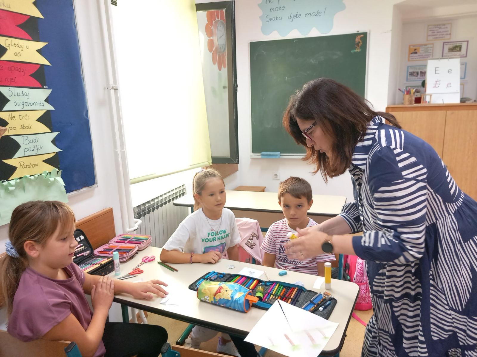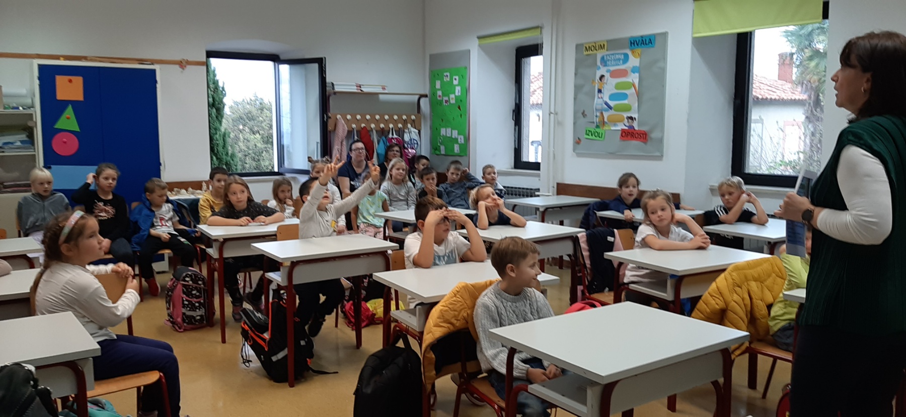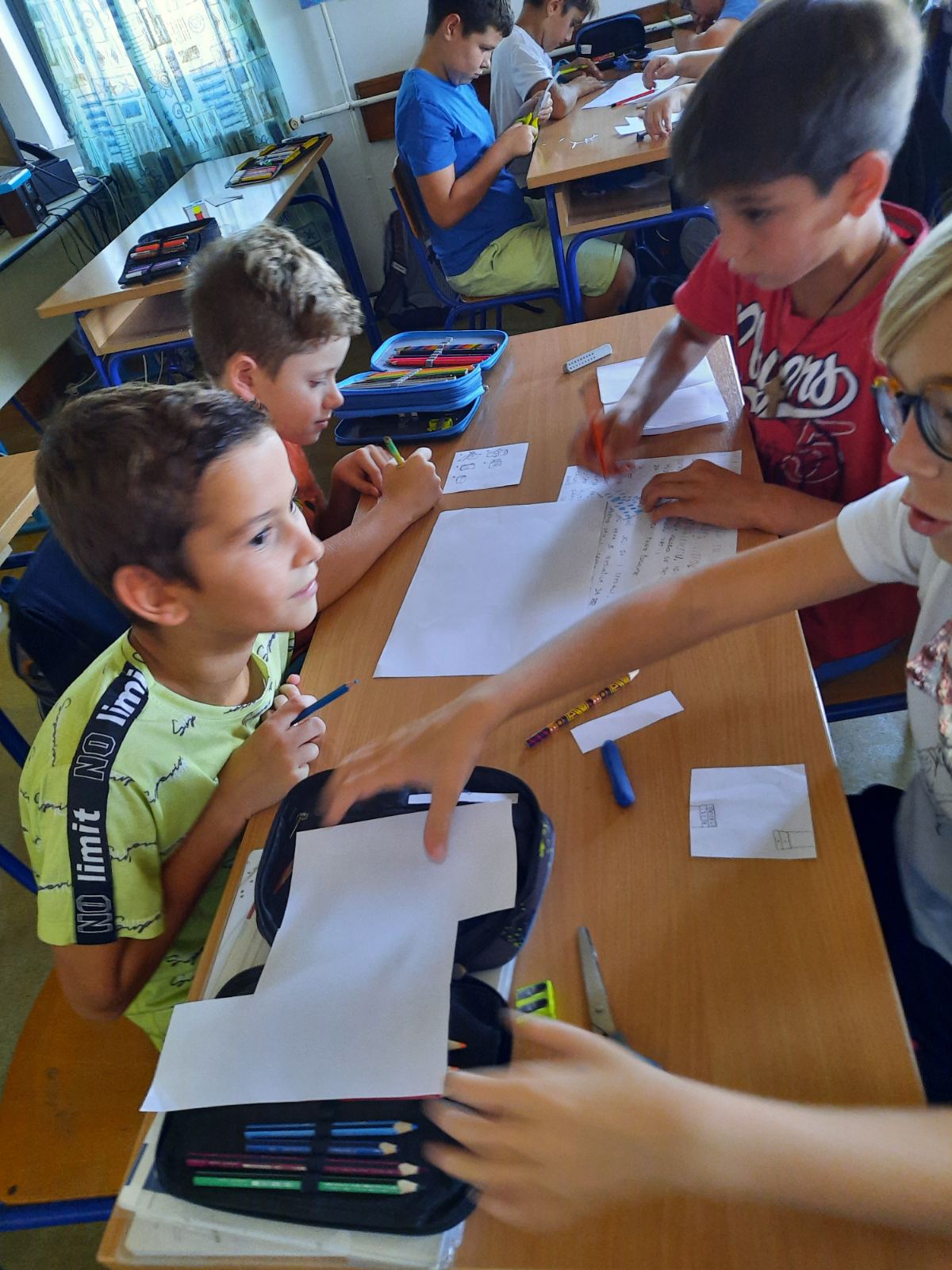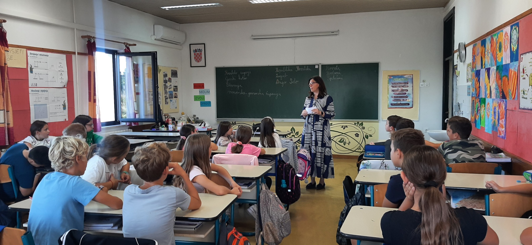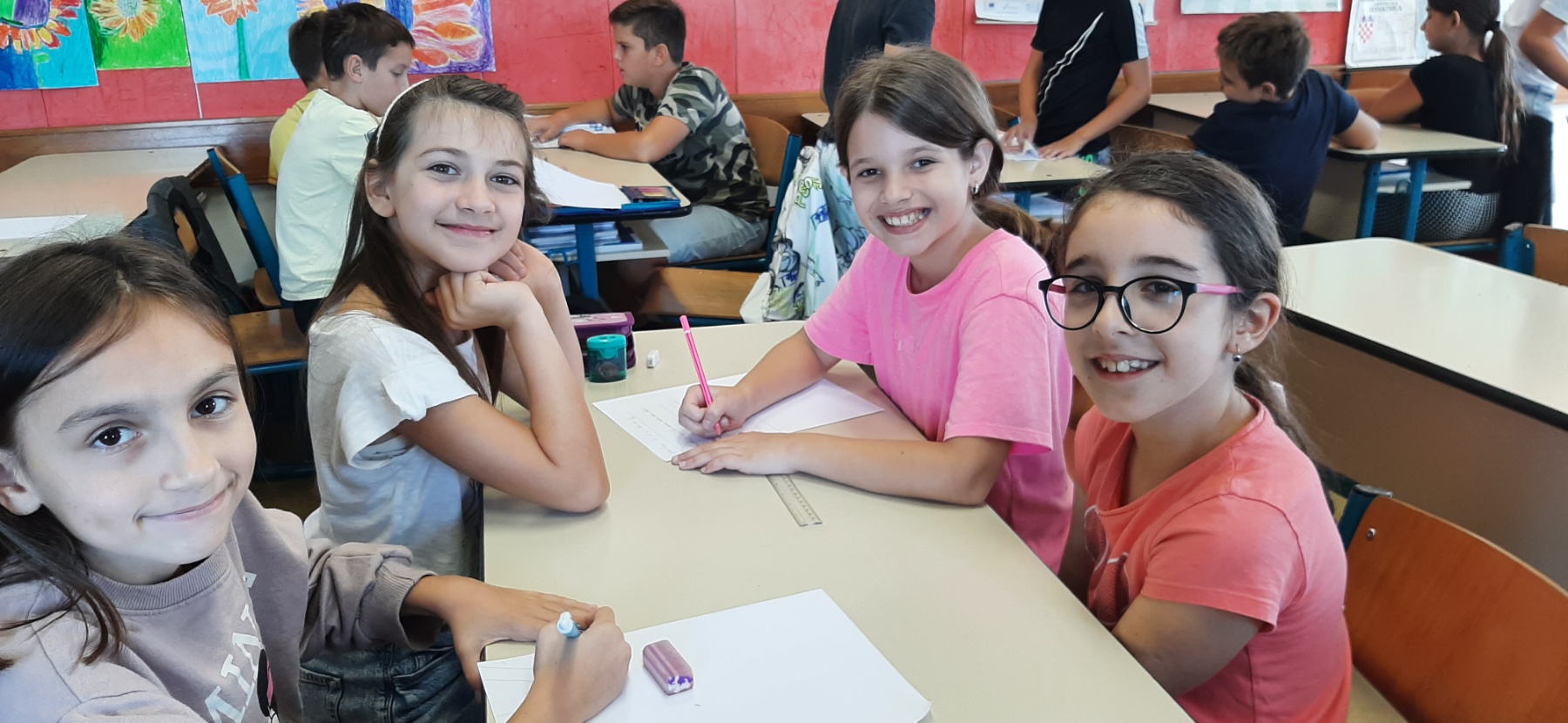 U petak 29. rujna posjetila nas je učiteljica Ivančica Toić, jedna od autorica Knjigomjera, interaktivne bilježnice za obradu lektirnih djela. U sklopu projekta Radionice za poticanje čitanja održala je u 2.a sat na kojem su djeca čitala, glumila, bojala, izrađivala trioramu – tehniku slaganja papira. Bilo nam je zabavno, smiješno i poučno. Satu su prisustvovali i promotori iz Školske knjige Maša Amalija Juretić i Dražen Rubeša. Tako da su u učionici bile, kako su djeca rekla, tri učiteljice i jedan učitelj. Svi smo marljivo crtali, bojali i na kraju napravili izložbu naših radova.