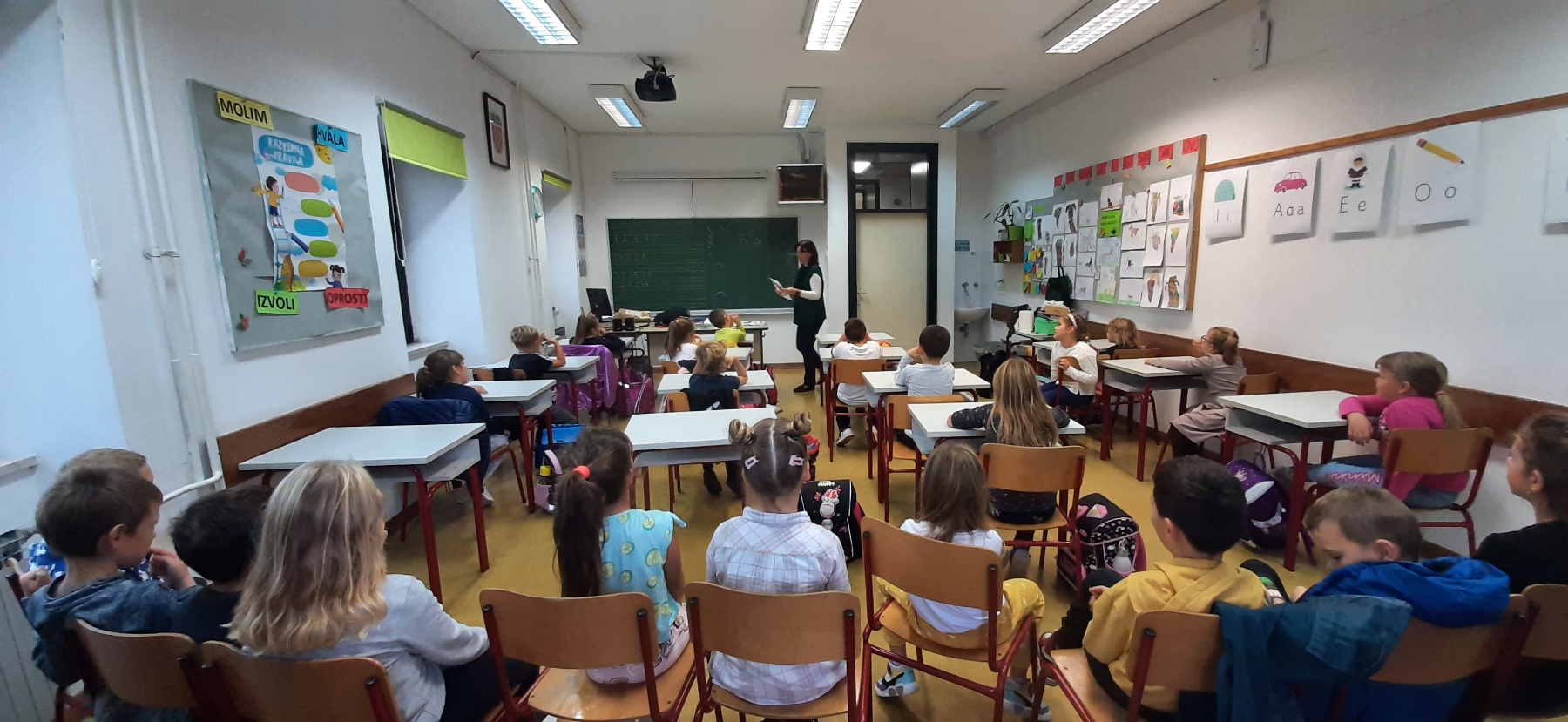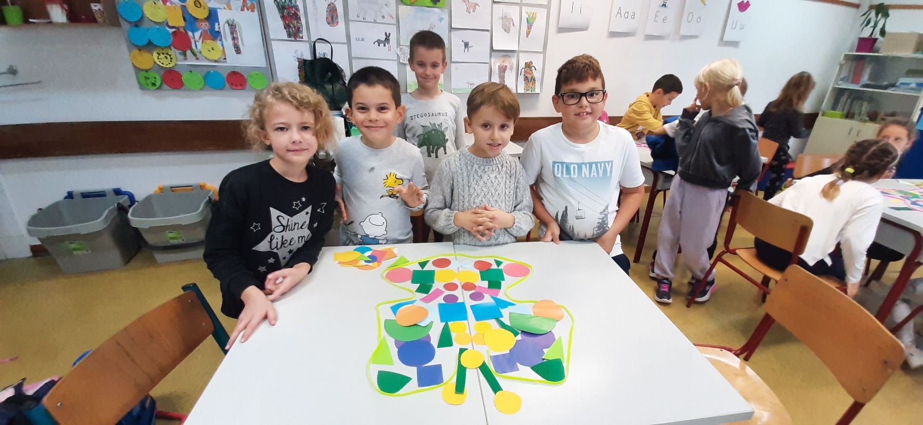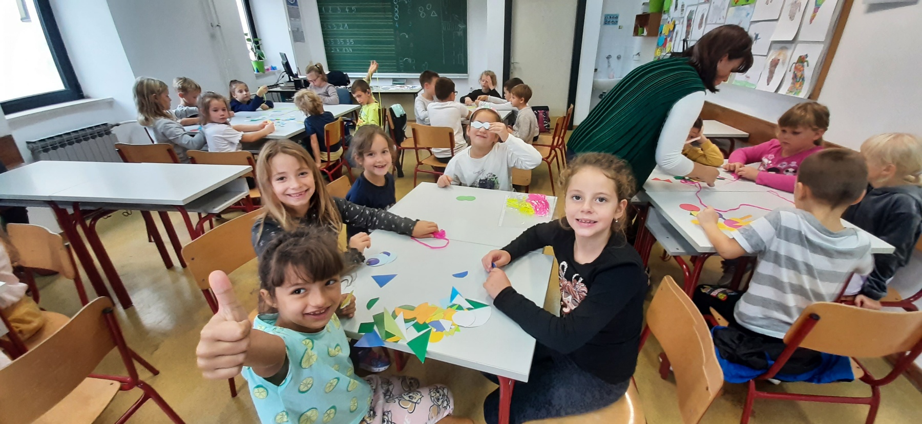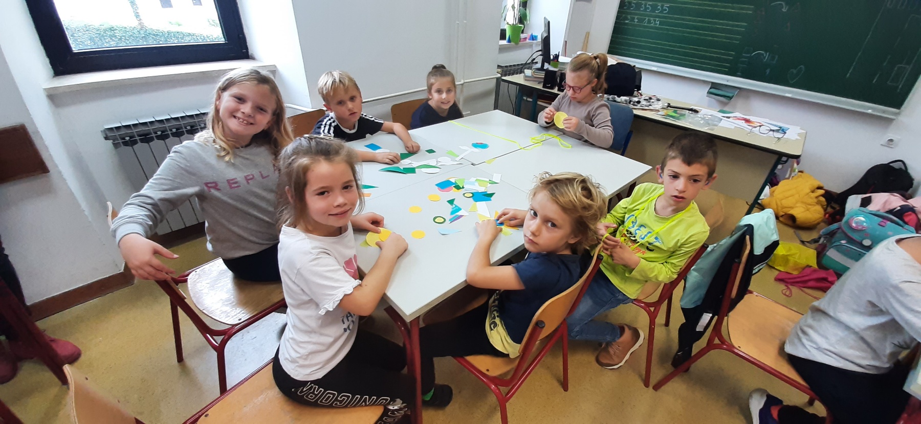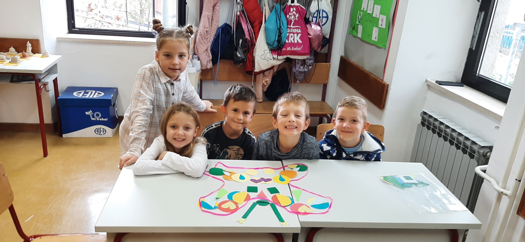 Učenici prvih razreda svoje druženje s gospođom Ivančicom započeli su čitanjem priče o leptiru, prema nizu slika. Dożivljaj lektire iskazali su verbalnom i neverbalnom komunikacijom. U završnom dijelu sata svaka je grupa imala zadatatak složiti leptira od geometrijskih i slobodnih oblika.
