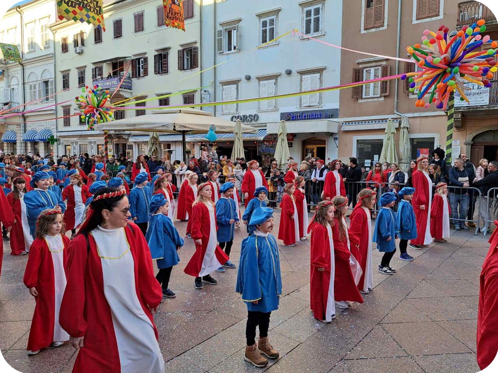 Dan nije mogao biti ljepši nego što je bio, sunce je sjalo visoko na nebu i grijalo mnoštvo malih maškara. Dok smo na rivi čekali svoj nastup, promatrali smo šarenilo maštovitih maski oko sebe, ali i divili se tradicijskim maskama – Grobničkim dondolašima, Zametskim i Halubajskim zvončarima, čije nas je zvonjenje jako razveselilo.
