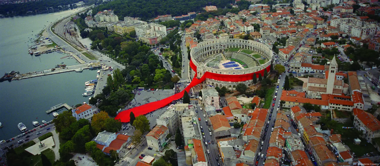 Prije 21 godinu, 18. listopada 2003. godine, izvedena je spektakularna instalacija Kravata oko Arene u Puli. Tom instalacijom, s najvećom kravatom na svijetu, simbolički je povezano antičko i suvremeno doba, a crvenom bojom kravate svijetu je upućena poruka ljubavi i suživota među ljudima i narodima. Putem televizijskih postaja, instalacija Kravata oko Arene postala je vrhunski svjetski spektakl, koji je vidjelo više od milijardu ljudi.