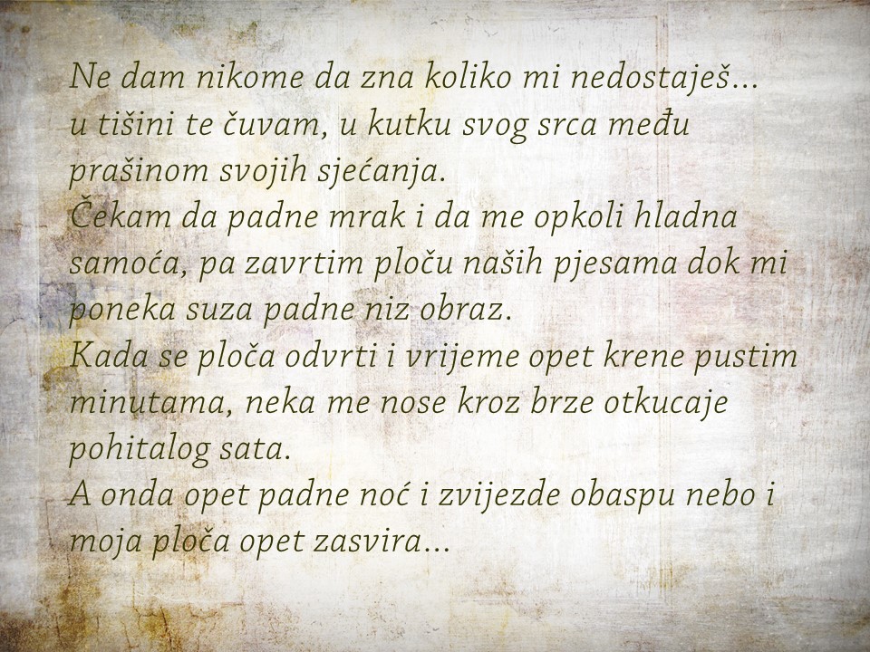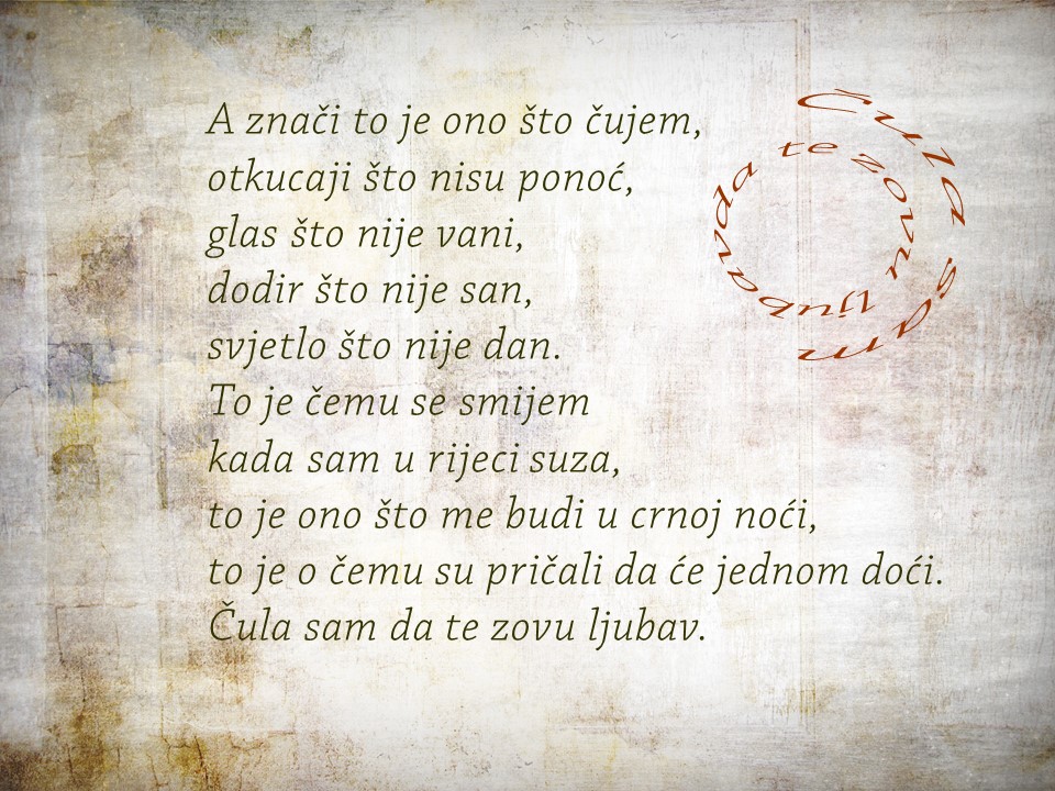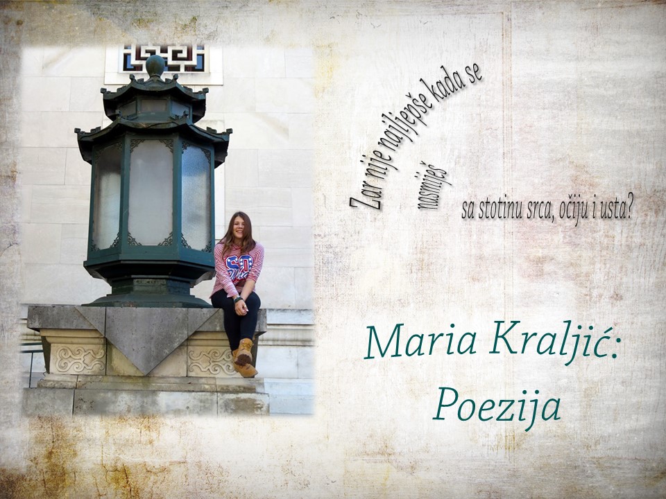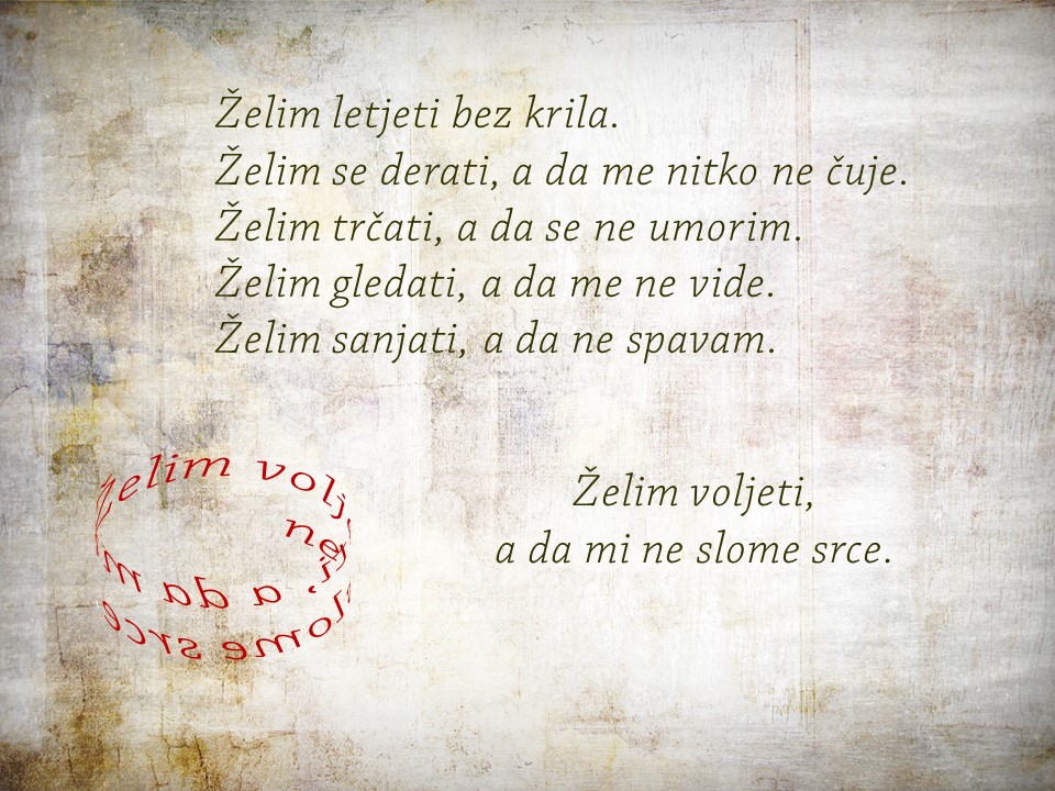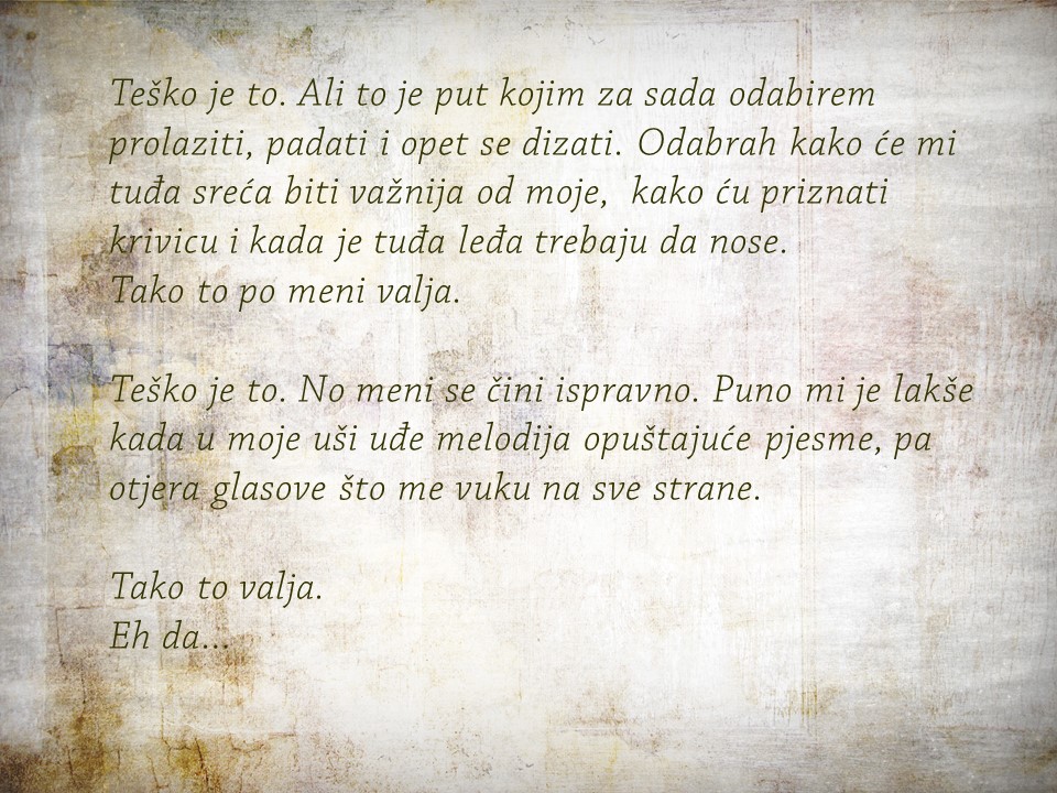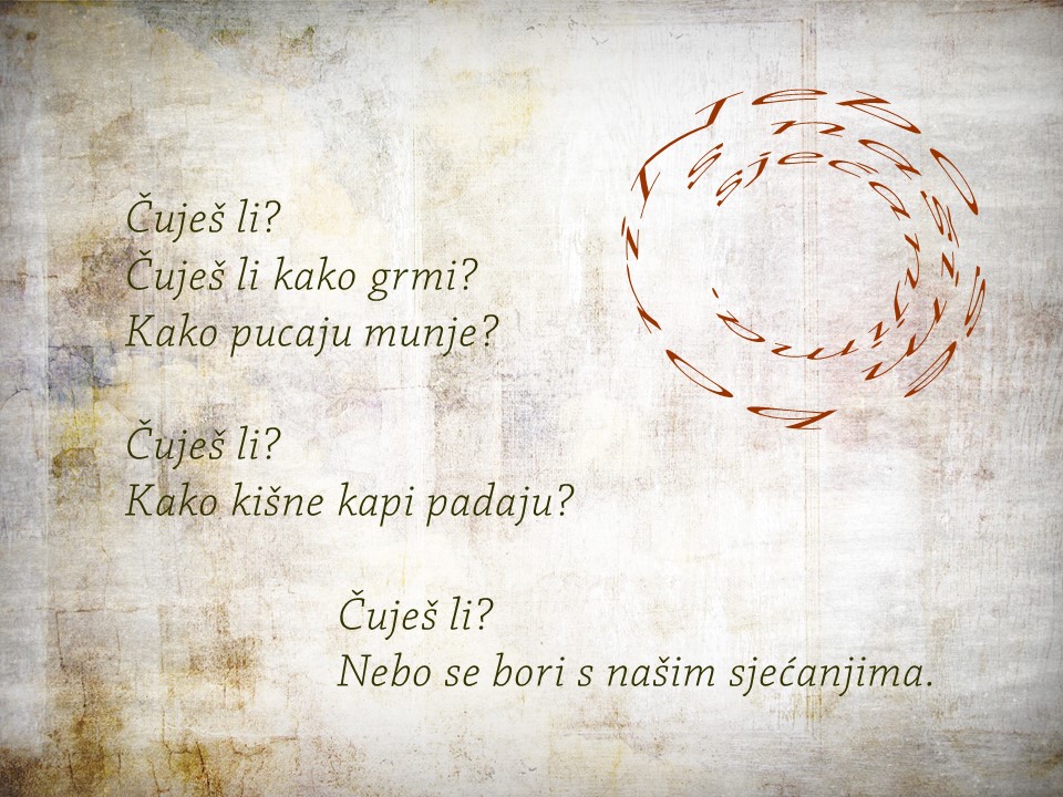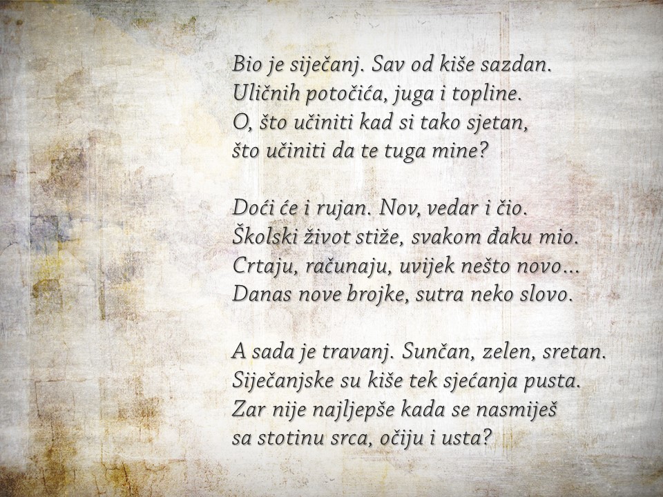 Bio je siječanj. Sav od kiše sazdan. Uličnih potočića, juga i topline. A sada je travanj. Sunčan, zelen, sretan. Siječanjske su kiše tek sjećanja pusta. Zar nije najljepše kada se nasmiješ sa stotinu srca, očiju i usta?