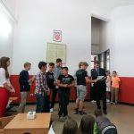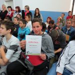 Započeli smo programom u školskoj sportskoj dvorani, nastupom gimnastičara koje vodi učiteljica Ljiljana Karabaić. Izveli su krasne vježbe koje čine ovu plemenitu disciplinu, na gimnastičkim spravama i parteru. U spomenutoj su sekciji učenici od 4. do 8. razreda. Revijalna nogometna utakmica između osmaša i pobjednika ovogodišnje Školske lige, 6. b razreda, zagrijala je sve učenike na tribinama i, srećom, završila neriješeno.