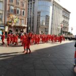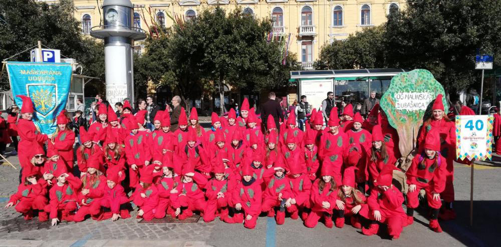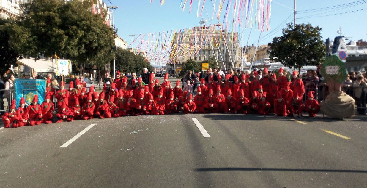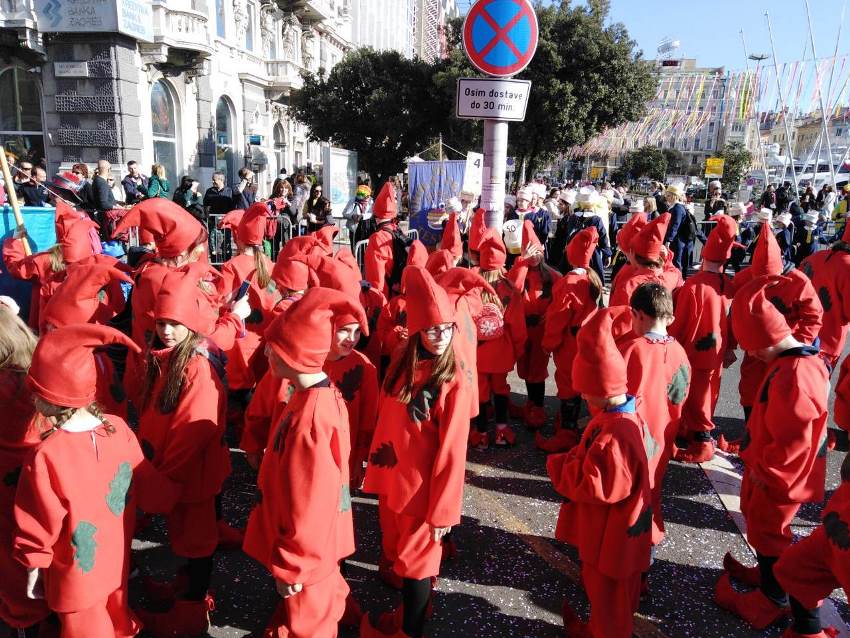 Oko 11 sati naši malići počeli su se skupljati na autobusnoj stanici u Malinskoj gdje smo okupljenim roditeljima i svima koji su nas došli ispratiti otplesali koreografiju koju smo spremili za nastup. Nakon tradicionalnog fotografiranja ispred autobusa krenuli smo prema Rijeci koja nas je dočekala u svom šarenom karnevalskom odijelu. Izgleda da se toga dana i zima odlučila maskirati u proljeće jer je vrijeme bilo predivno, pravo proljetno. Pridružili smo se mnoštvu malih maškarica koje su na rivi strpljivo čekale svoj red za povorku. Bilo je tamo svakakvih maski i sa zanimanjem smo upijali svo to šarenilo i skupljali ideje za neke buduće karnevale. Mnogi su i nas promatrali sa zanimanjem i raspitivali se što naša maska predstavlja. Ubrzo su nas pozvali naprijed i krenuli smo i mi u povorku, praćeni mamama, tatama i ostalima koji su nas došli podržati iz publike. Neumorno smo plesali i skakali te tako došli do kraja karnevalske rute gdje smo se okrijepili krafnama i sokom.
