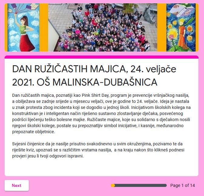 Pozivamo sve učenike i učitelje da sutra, u srijedu 24. veljače, obuku ružičaste majice ili bilo koji odjevni predmet ili modni dodatak ružičaste boje. Također, pozivamo sve učenike da riješe i kratki edukativni KVIZ o vršnjačkom nasilju – poveznica za kviz nalazi se u nastavku.