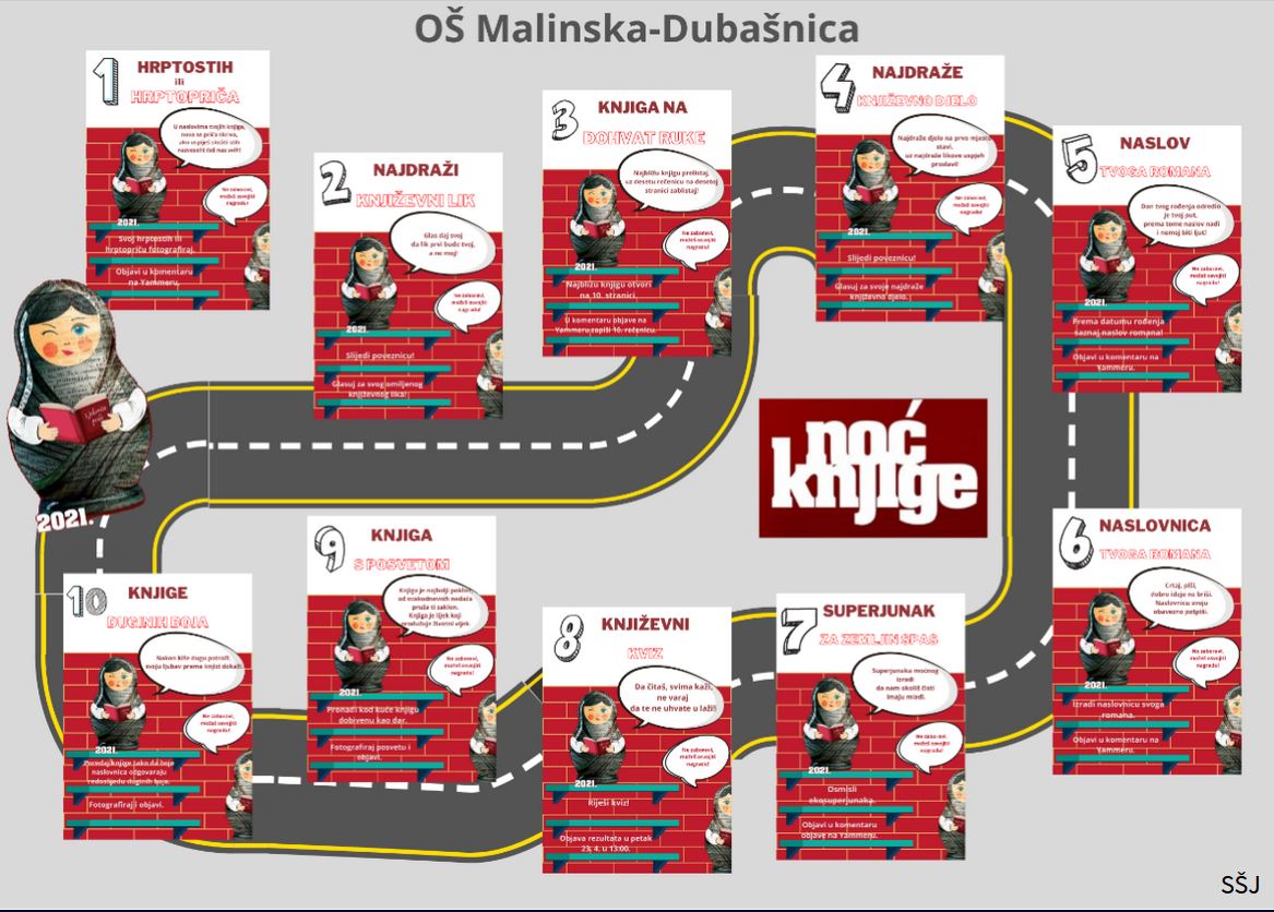 Ove smo godine obilježili Noć knjige u virtualnoj knjižnici na Yammeru za učenike predmetne nastave i na Padletu za učenike razredne nastave. Aktivnosti su se održavale tijekom cijeloga tjedna (19. – 23. travnja) jer je za desetu godinu održavanja pripremljeno deset zabavnih aktivnosti. Učenici su se zaista u velikom broju odazivali i pronalazili aktivnosti u skladu sa svojim interesima te je naposljetku deset najaktivnijih učenika i nagrađeno.