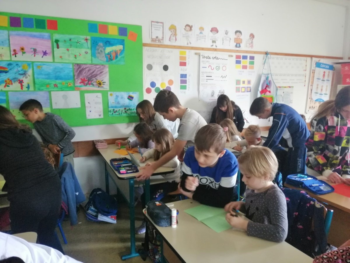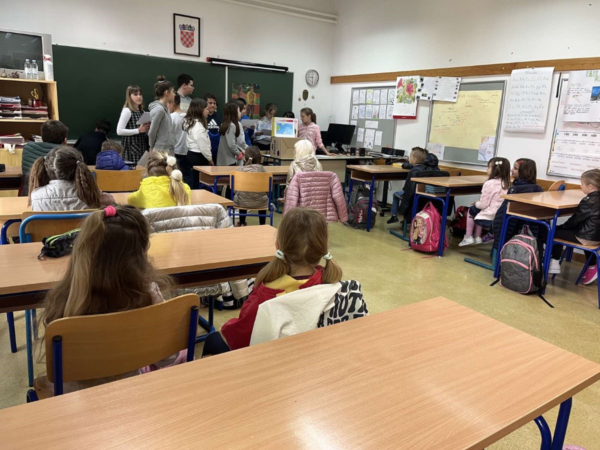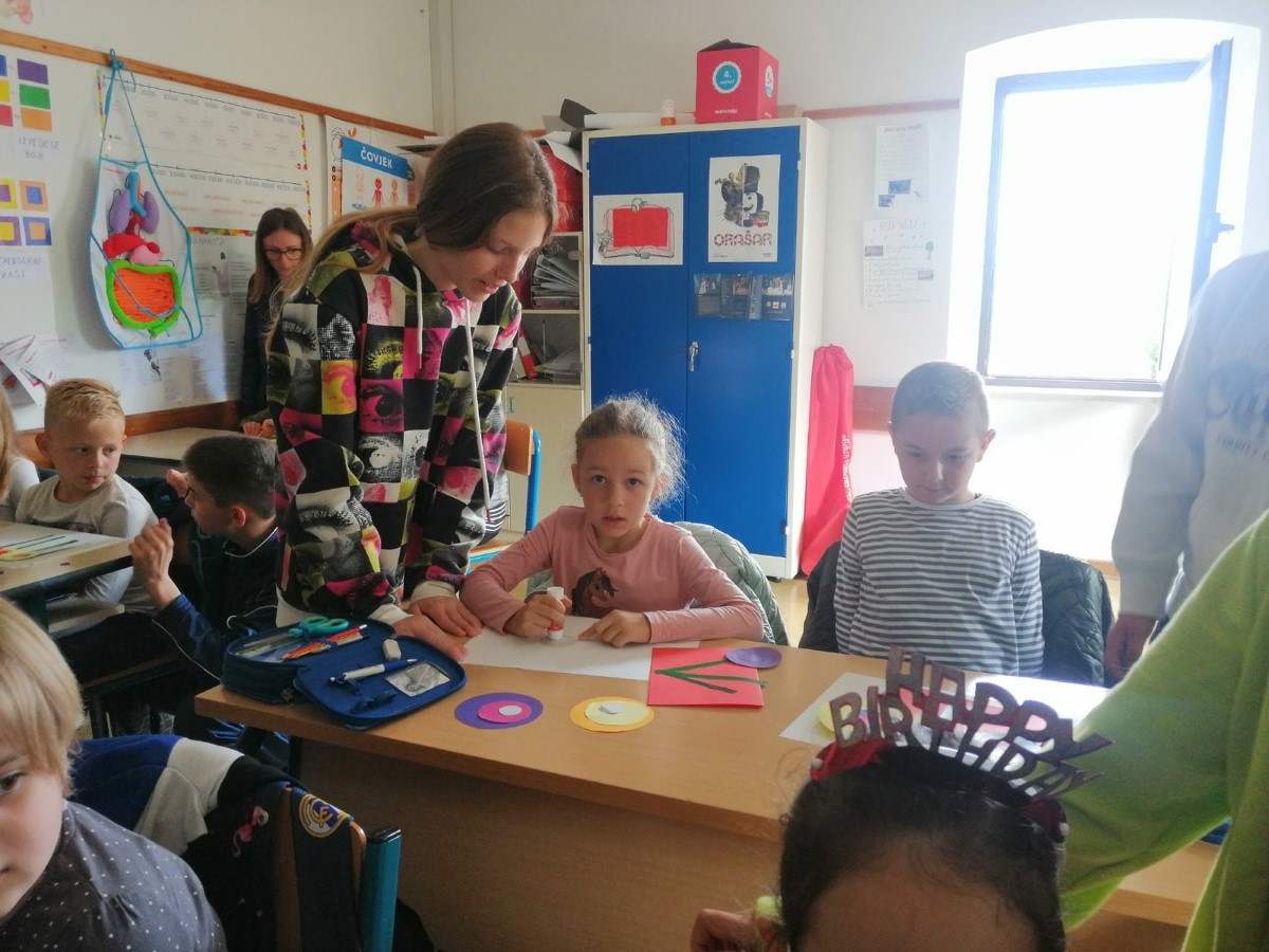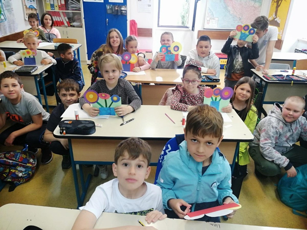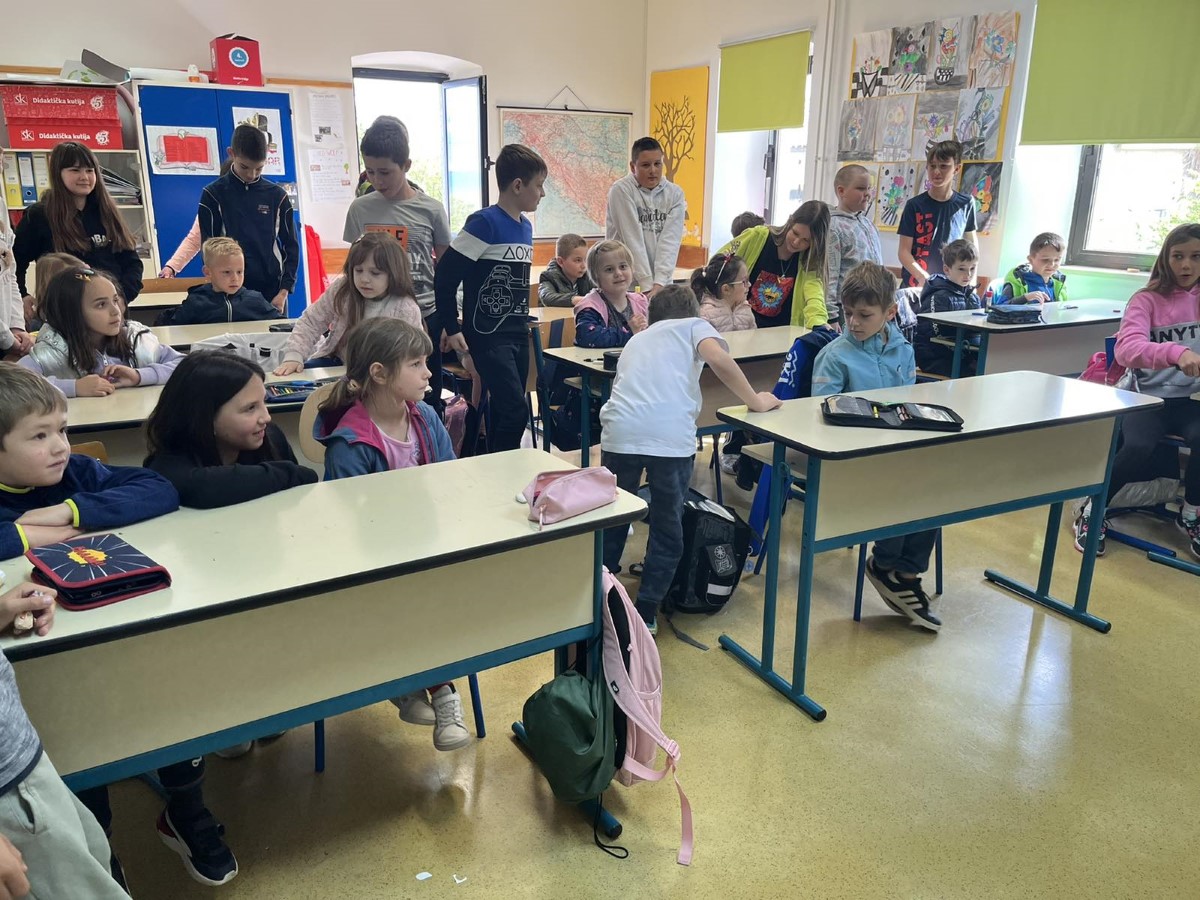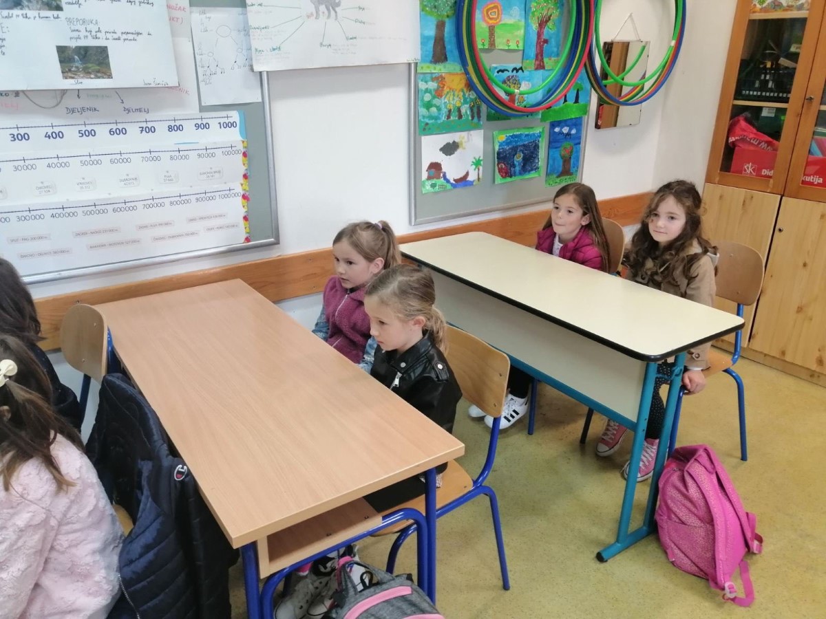 Svaki je predškolarac pronašao svoje mjesto u klupi, a zatim su izrađivali čestitke i pogledali predstavu koju su za njih pripremili učenici. Cilj je ovog posjeta upoznavanje prostora škole i učionice prije procjene psihofizičkog stanja učenika prije polaska u prvi razred koje nam započinje u ponedjeljak 2. svibnja i traje do 10. svibnja 2022. godine od 8:30-10:00 sati.