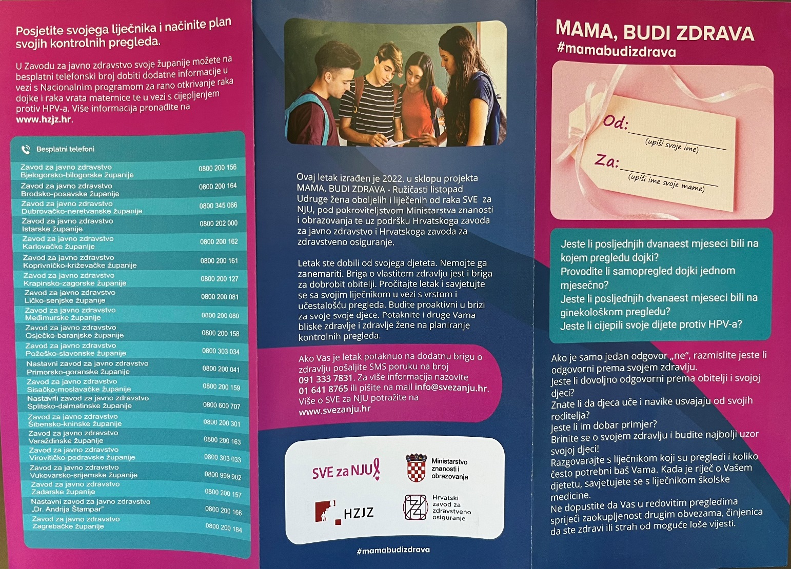 Mjesec listopad Međunarodni je mjeseca borbe protiv raka dojke, tim je povodom Udruga SVE za NJU osmislila projekt „Mama, budi zdrava – Ružičasti listopad“. 🎀