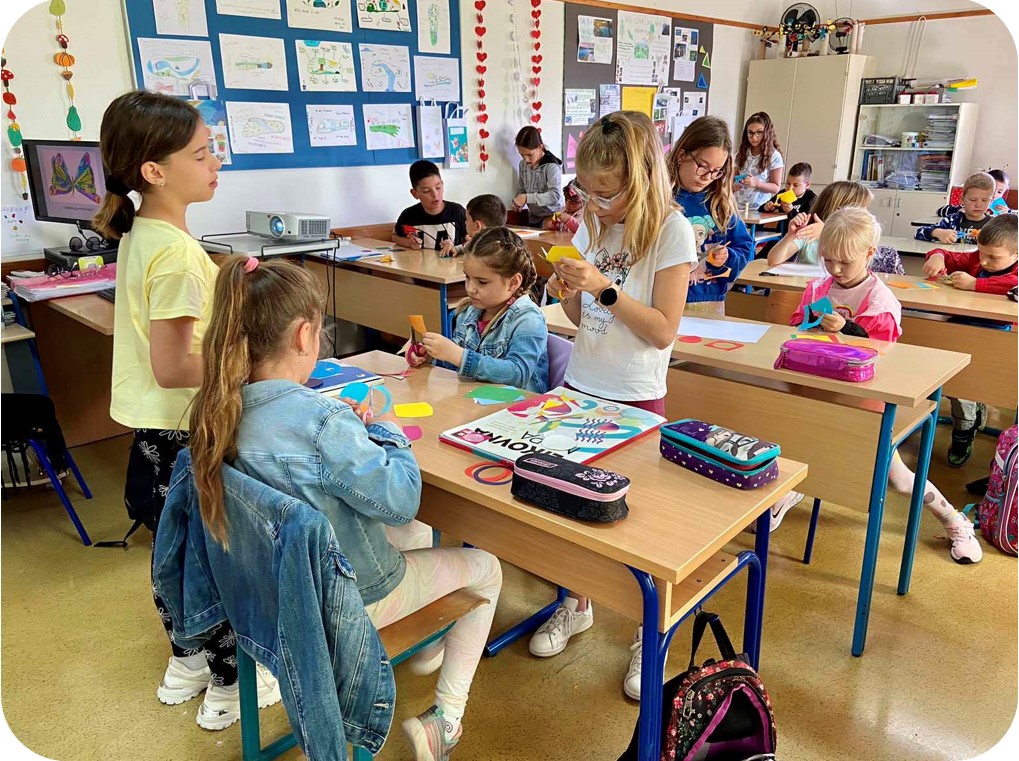 Gotovo svatko od njih pronašao je brata, sestru, bratića, sestričnu ili barem poznanika što ih je posebno obradovalo. Nakon, za njih, vrlo glasnog školskog zvona dočekali su svoje buduće učiteljice i u pratnji svojih odgojiteljica hrabro krenuli prema učionicama. Tamo su ih lijepo dočekali i primili četvrtaši, imali su prilike vidjeti kako je to sjediti u školskoj klupi i čuti što se sve radi u školi. Sudjelovali su u zajedničkoj aktivnosti, slušali priču, izrezivali i lijepili krugove za gusjenice, pjevali i plesali. Kada je školsko zvono označilo kraj sata u veselom su se raspoloženju zaputili natrag u svoj vrtić.