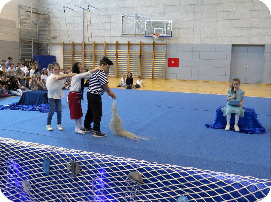 Uplovili smo potom u hrvatske vode. Učenici 1.a razreda izveli su dramsku igru koju je prilagodila učiteljica Ivona Dundović-Ljutić. Svima poznata priča Djed i repa za ovu priliku postala je Djed i more. Uslijedila je čakavska pjesma More nastala na izvannastavnoj aktivnosti Čakavska grupa. Pjesmu su napisale Marta Čorak i Veronika Barbiš, a njihove riječi prenio je Marko Mrakovčić. Poslušali smo potom kako zvuči suradnja jedne od naših najmlađih učenica i jedne od najstarijih, odnosno prvašice i osmašice. Magdalena Kirinčić iz 1. a razreda i Lucija Bajčić iz 8. a razreda recitirale su pjesmu Pjeni se more na standardnome hrvatskome jeziku.