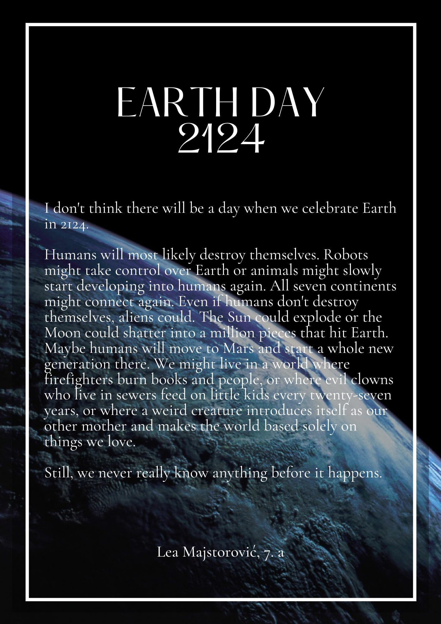 Učenici 5. b i 7. b razreda izrazili su se putem akrostiha o Danu planeta Zemlje dok su učenici sedmih i 8. b razreda zamišljali kako ćemo taj dan obilježavati za stotinu godina i o tome pripovijedali na engleskome jeziku. Svestrani umjetnici oplemenili su pisane uratke likovnim stvaralaštvom.