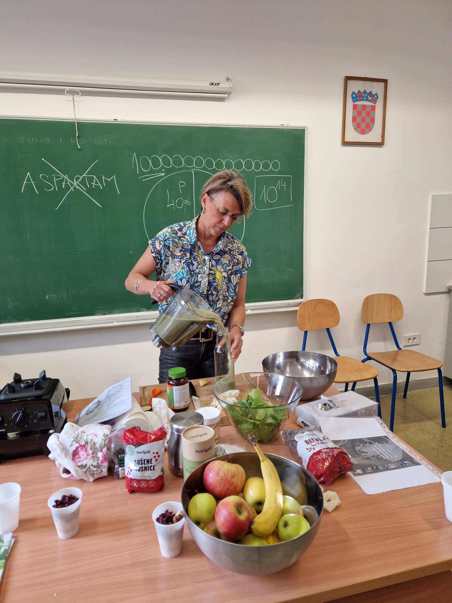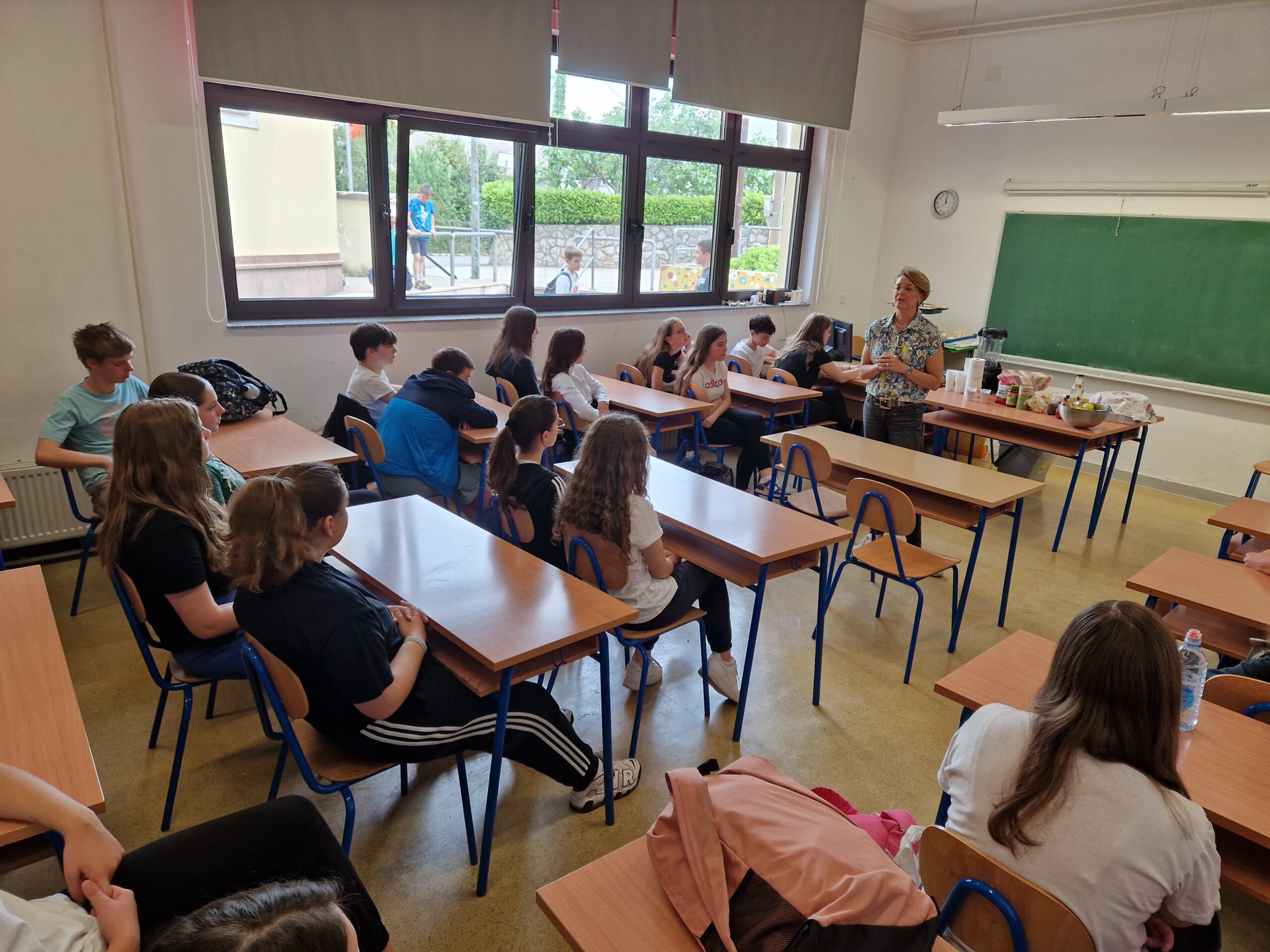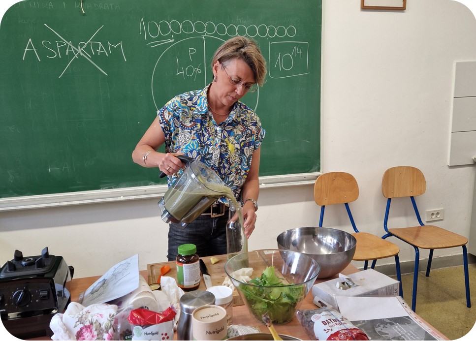 Nakon teorijskog dijela prezentirane su nam namirnice od kojih ćemo napraviti zdravi napitak. Uz voće i povrće, dobili smo zadatak raspoznati samoniklo bilje te smo naučili da su maslačak, trputac, kopriva i list cikle vrlo zdravi i hranjivi. U zdravi napitak dodali smo šaku samoniklog bilja, orašaste plodove te grožđice za slatkoću. Učenici su degustirali napitke te su im podijeljene brošure – kratki vodiči o zdravim prehrambenim navikama u kojima mogu pronaći recepte za zdrave napitke.