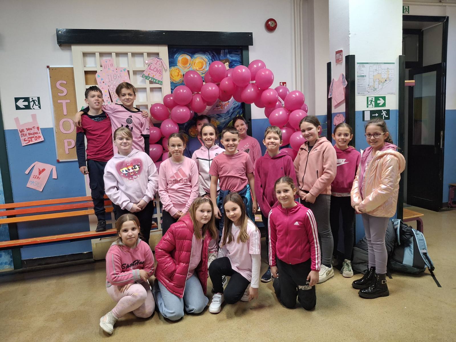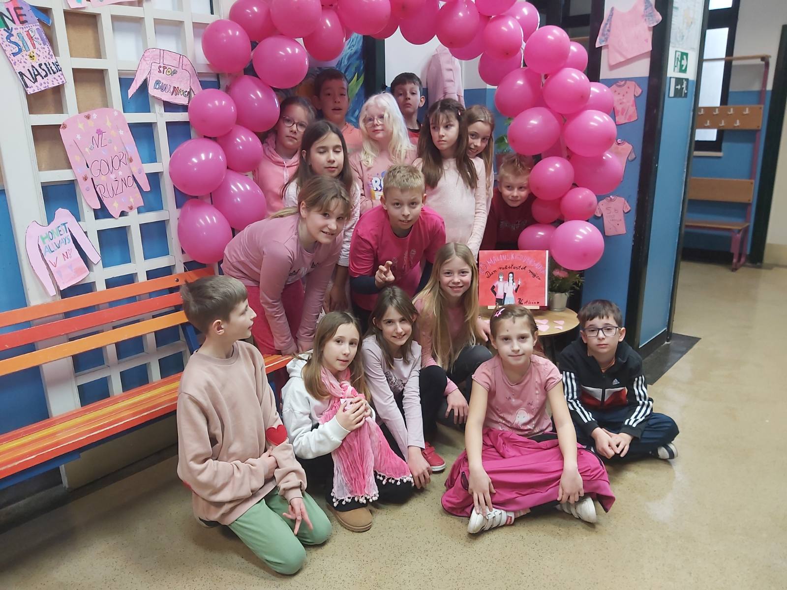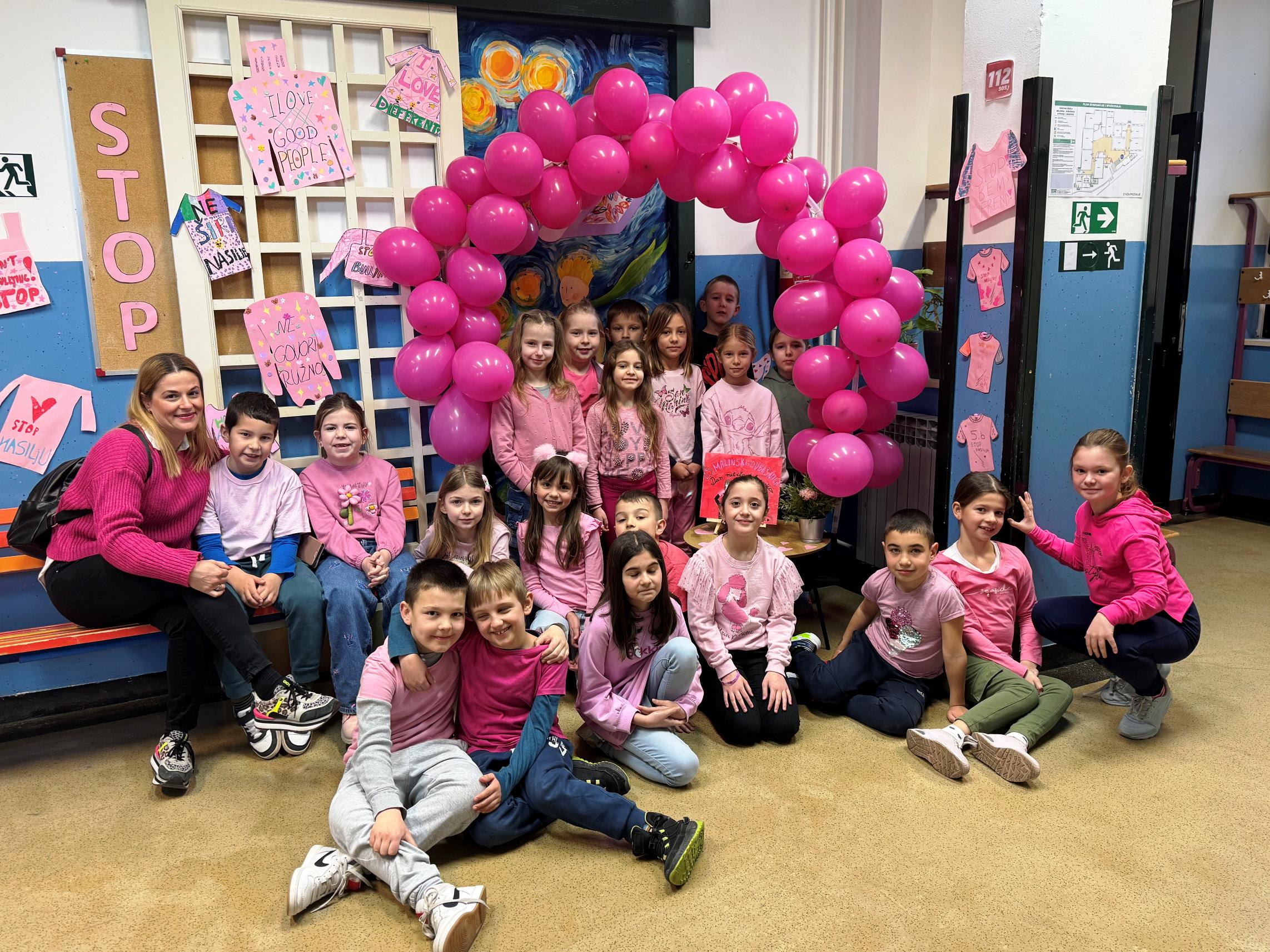 Većina je učenika u školu došla odjevena u ružičastu majicu ili s nekim ružičastim detaljem. Kutak u školskom holu ukrašen je ružičastim balonima i crtežom naše Leticije Turčić koji poziva na nenasilje i pružanje međusobne podrške. Snimili smo i zajedničku fotografiju ispred škole.