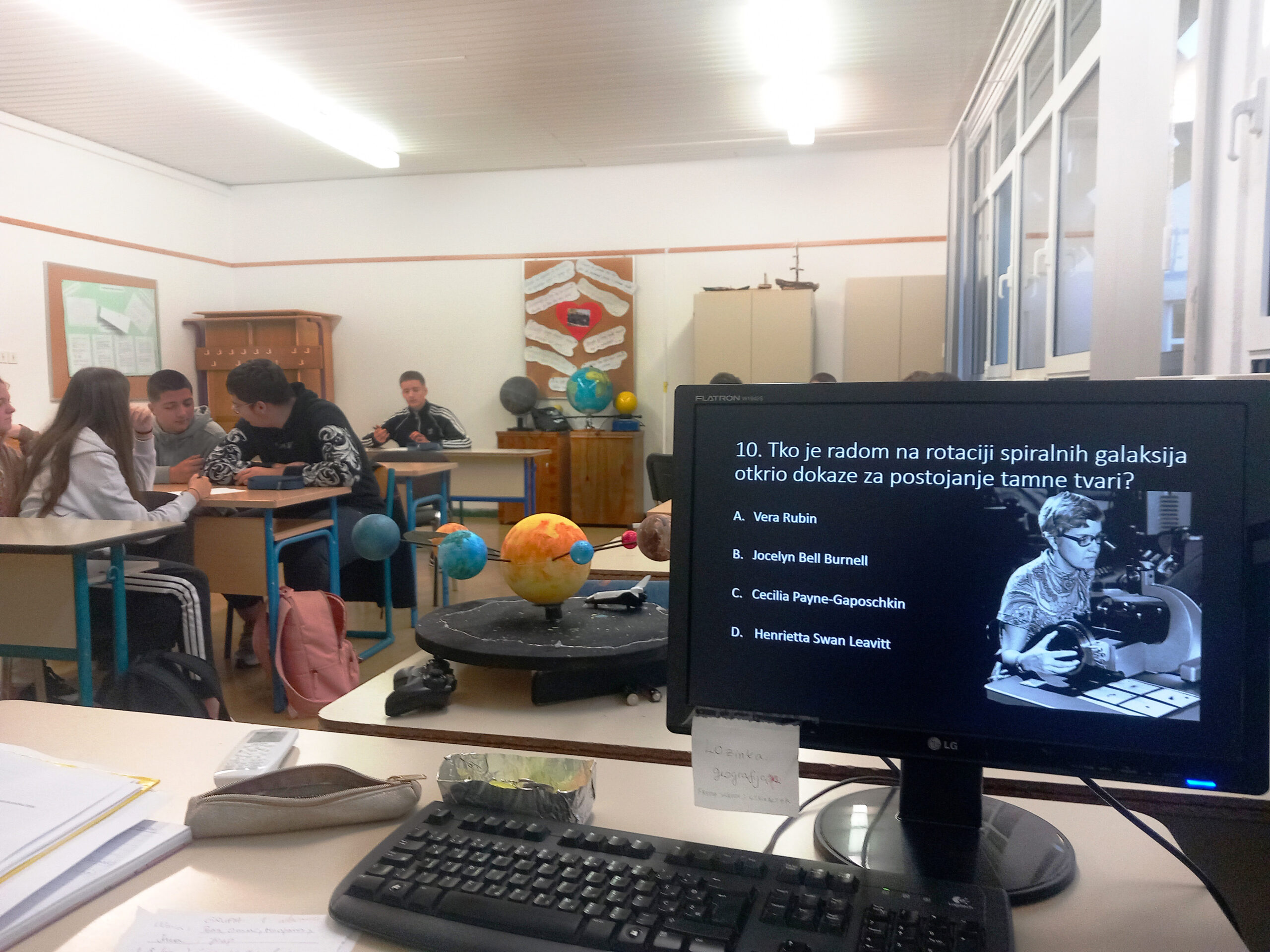 U sklopu cjelogodišnjeg projekta na razini škole „Žene u znanosti, obrazovanju i kulturi“, u srijedu 22. listopada, održao se kviz na temu „Žene u astrofizici i svemiru“. Učenici osmih razreda su na satu Geografije proširili znanje iz nastavne cjeline Svemir te se upoznali sa radom brojnih znanstvenica i njihovim postignućima.